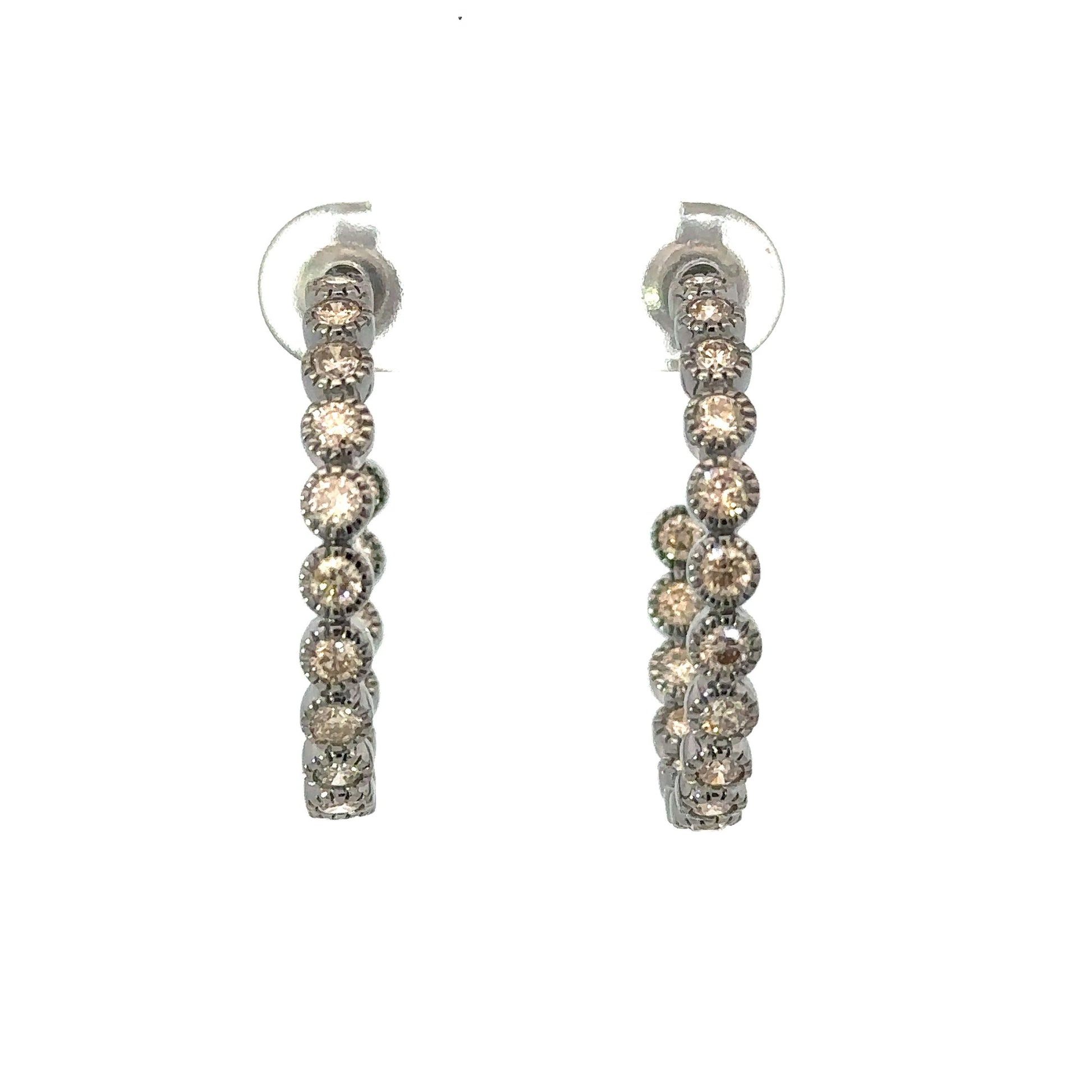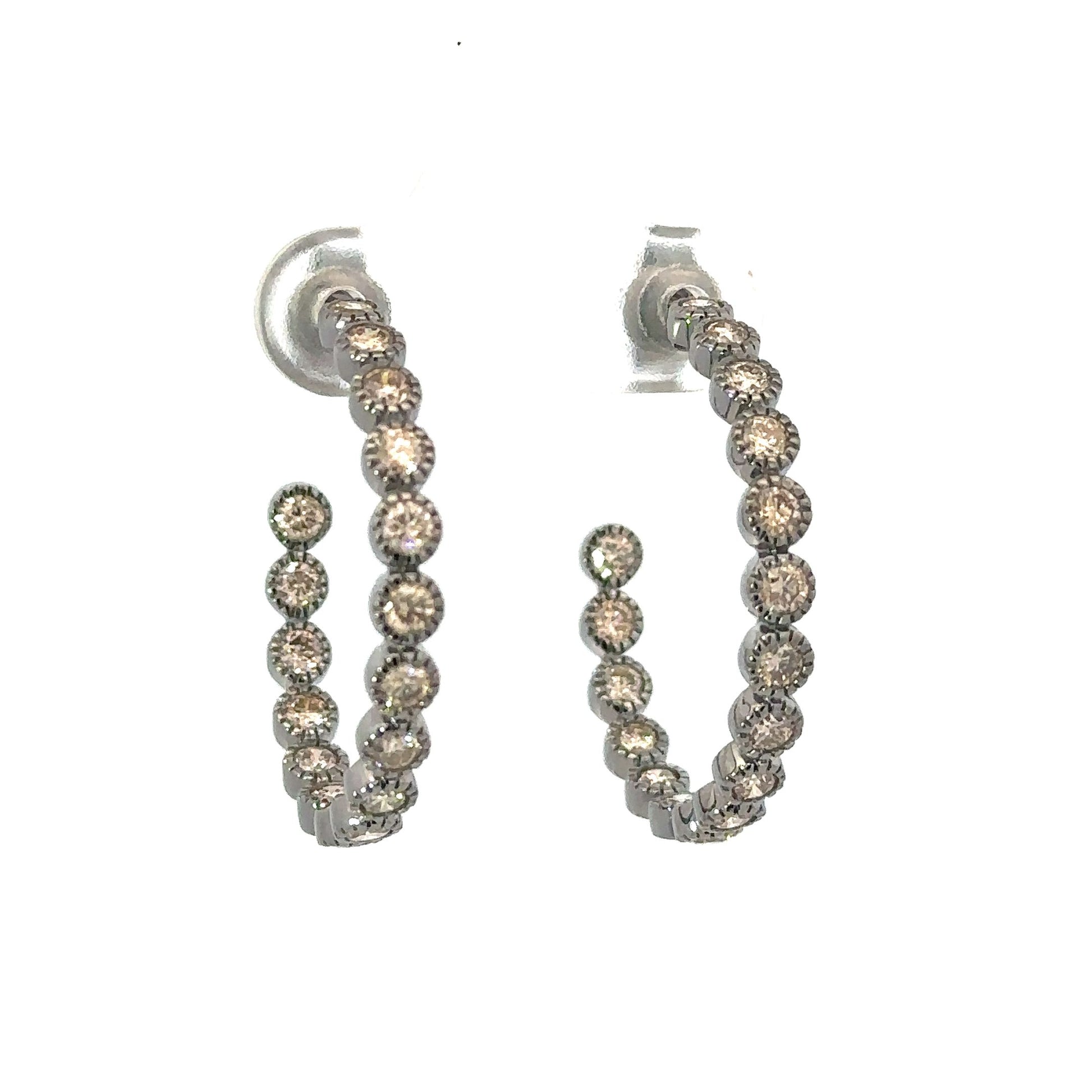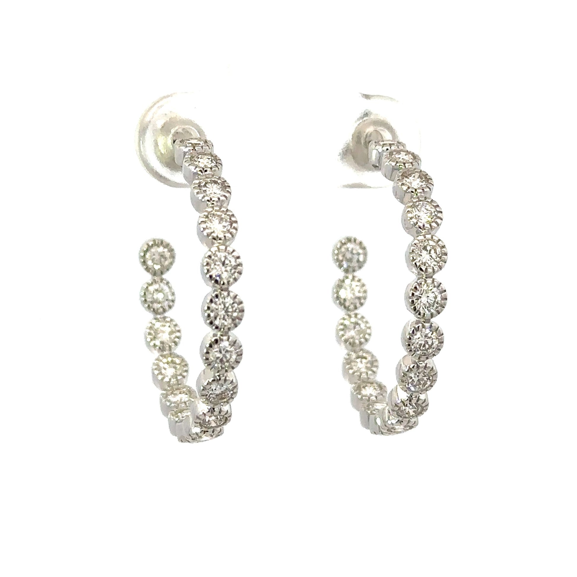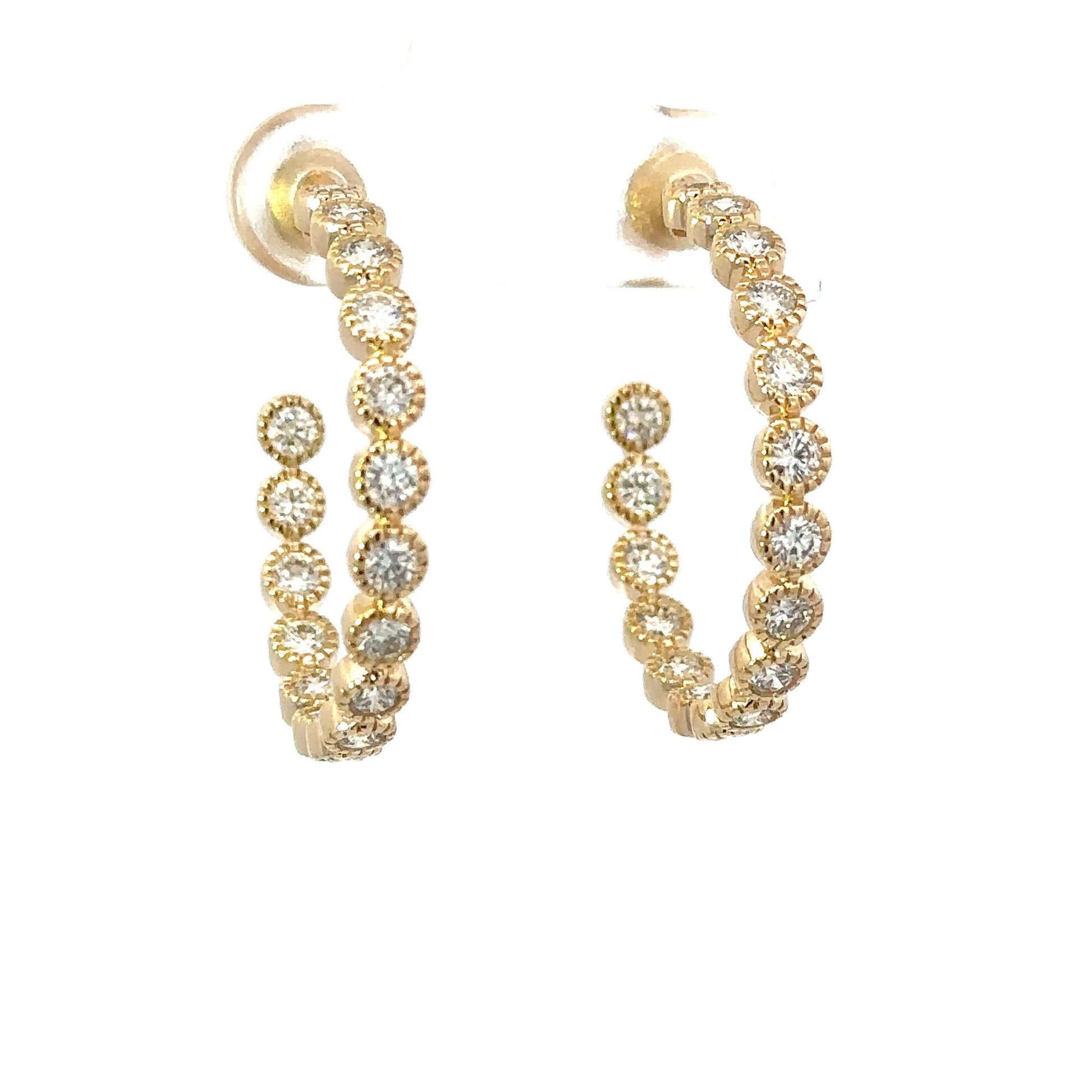 These 1" hoops feature a milgrain border and are crafted in sterling silver, yellow gold, or white gold. They showcase 3.3mm diamonds, totaling 1.59 carats, combining classic design with expert craftsmanship.
