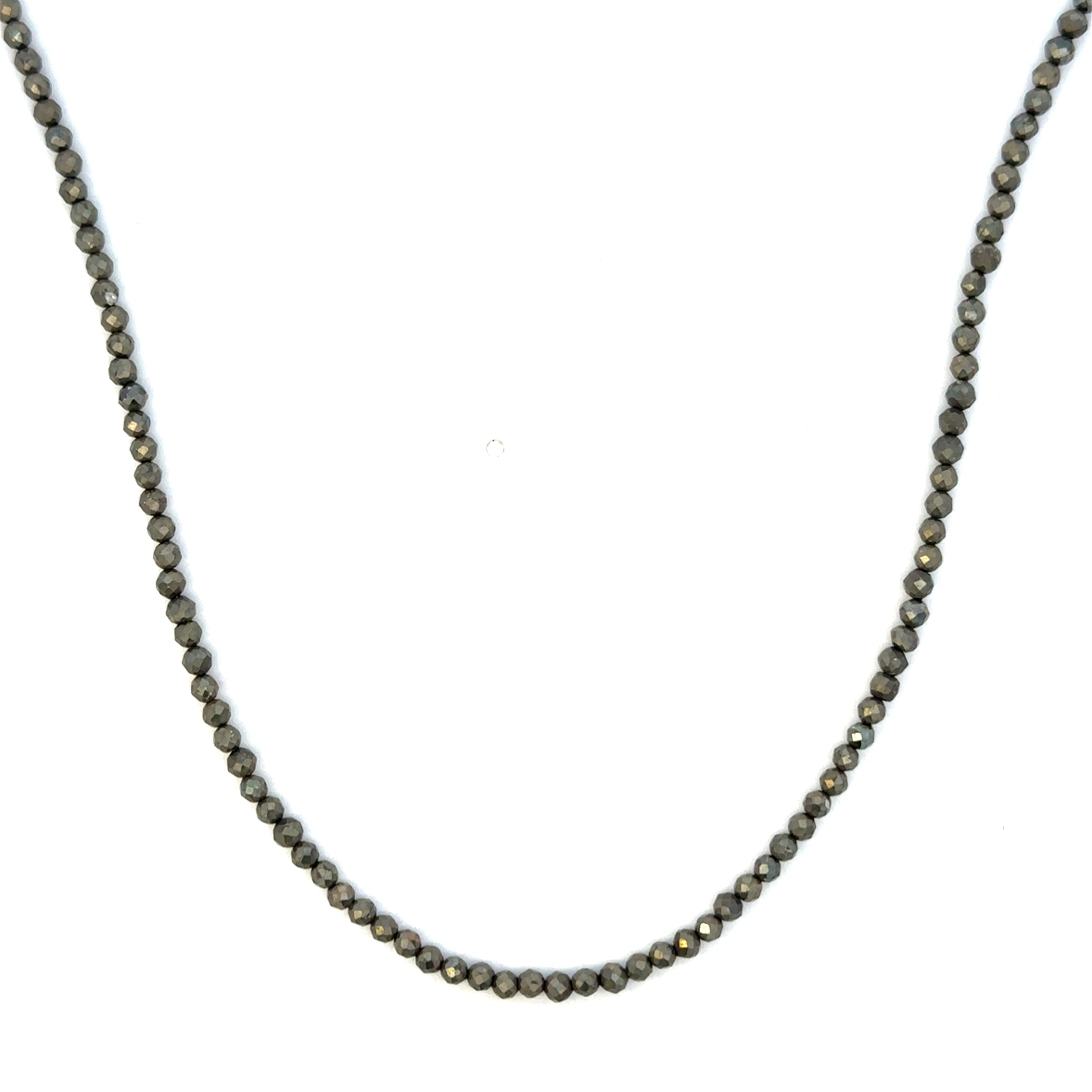 This necklace features 2.5mm pyrite beads strung along a 16-inch length, showcasing expert craftsmanship and a refined design.