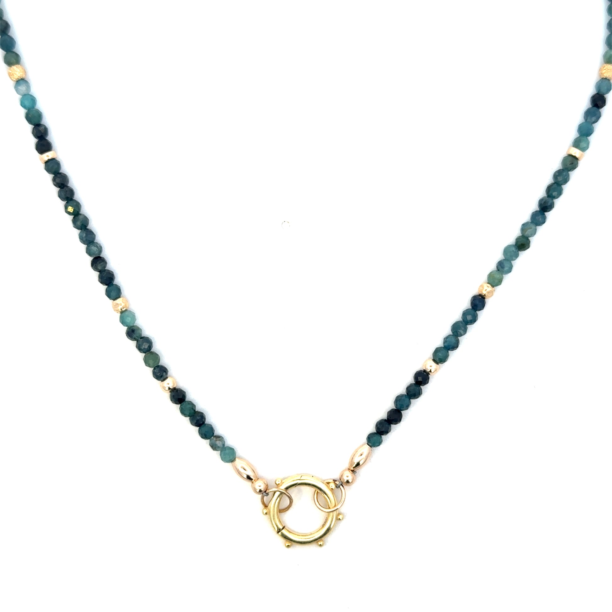 This 16" necklace features 3mm blue tourmaline beads paired with gold-filled beads, designed with an open-ended style and finished with a choice of a circular or carabiner-shaped bail for versatile wear.