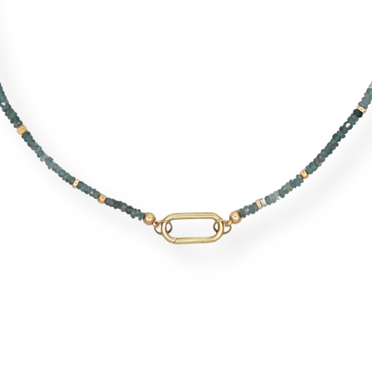 This 16" necklace features 3mm moss aquamarine beads paired with gold-filled beads, designed with an open-ended style and finished with a choice of a circular or carabiner-shaped bail for versatile wear.