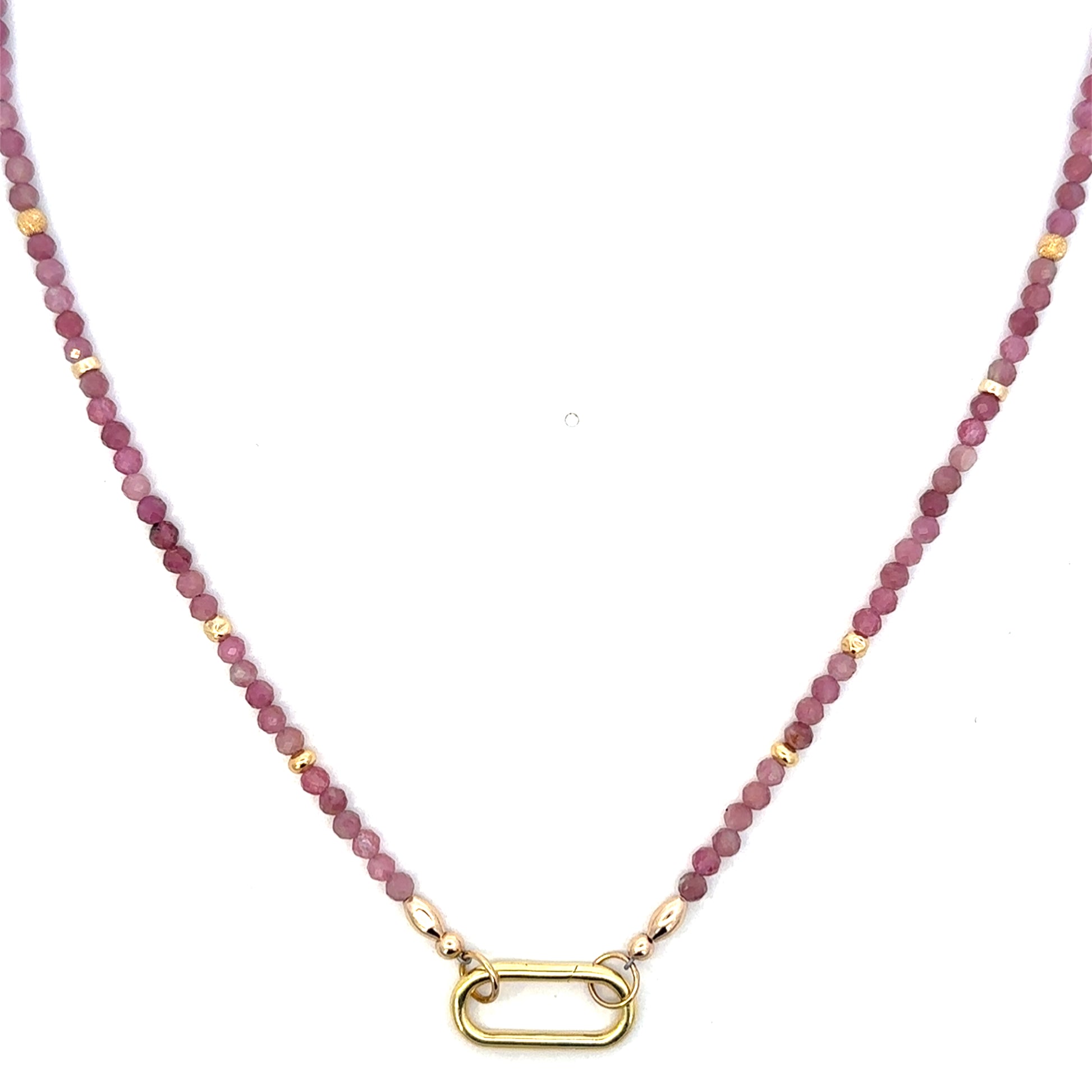 This 16" open-ended necklace features 3mm pink tourmaline beads paired with gold-filled accent beads, finished with a functional bail available in either a circle or carabiner shape.
