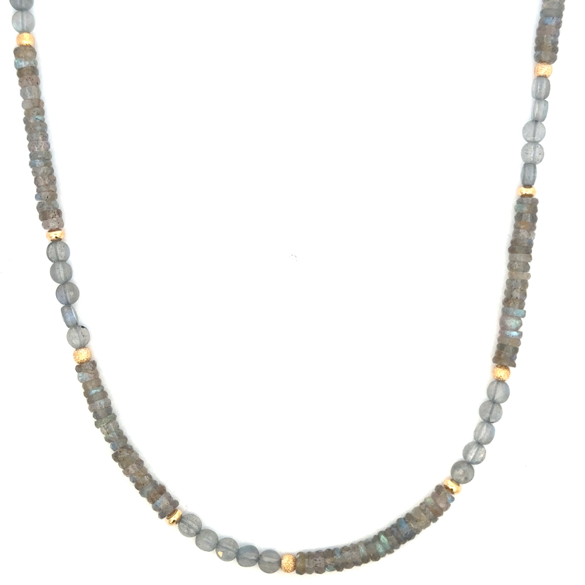 This 16" necklace features 4mm labradorite beads in alternating coin and roundel shapes, complemented by gold-filled accents for a refined finish.