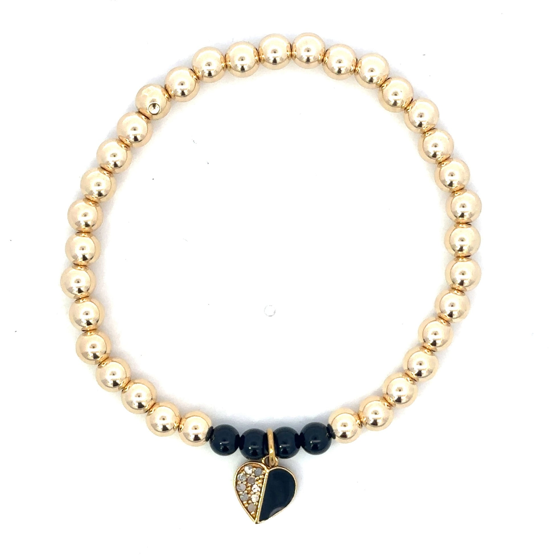 This 7" bracelet features 5mm gold-filled beads paired with black beads, complemented by a vermeil heart charm adorned with black enamel and pave detailing.