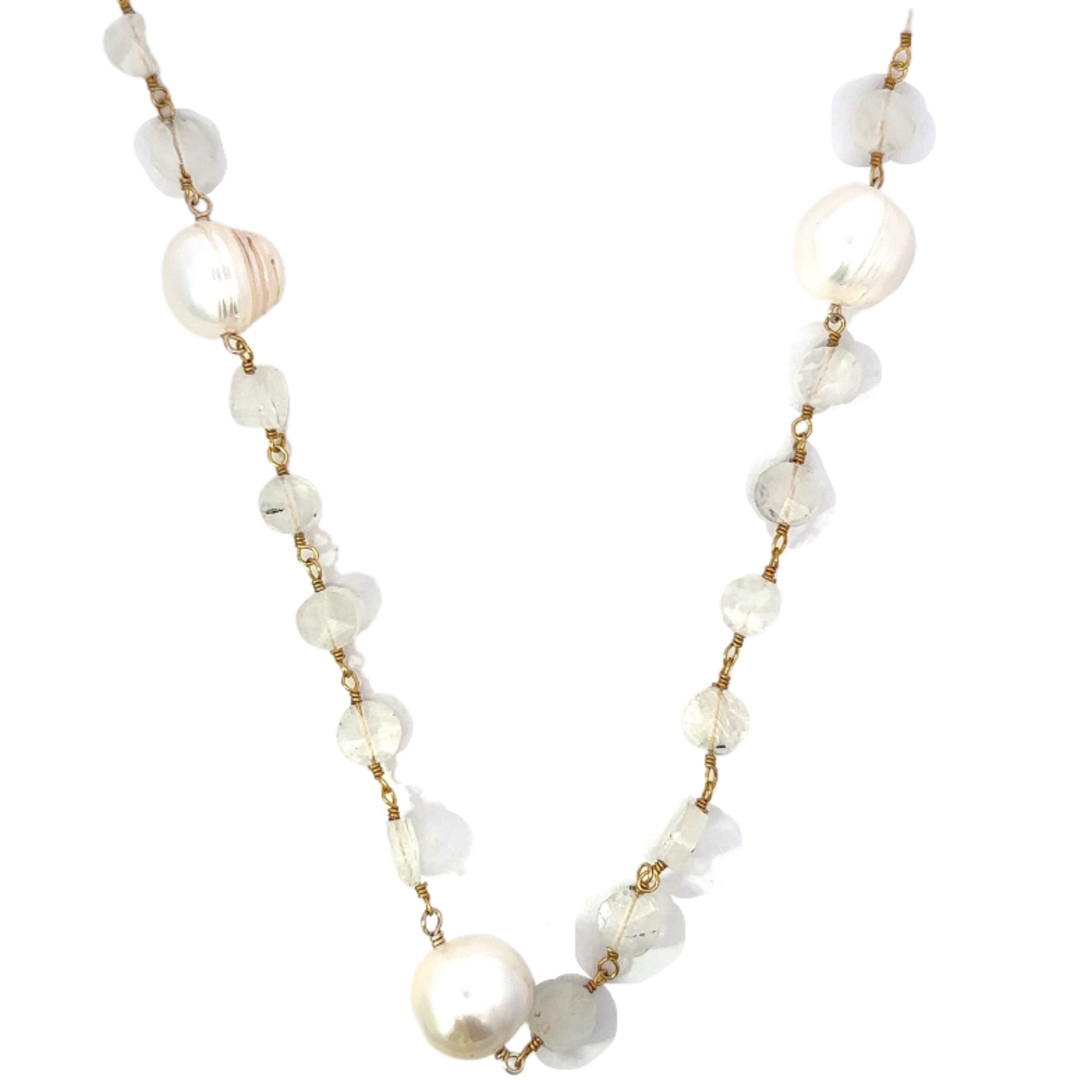 This necklace features an approximate 36" length composed of coin-shaped moonstones and 6.5mm white round pearls measuring around 12mm, all on a gold-tone wire for a sophisticated finish.