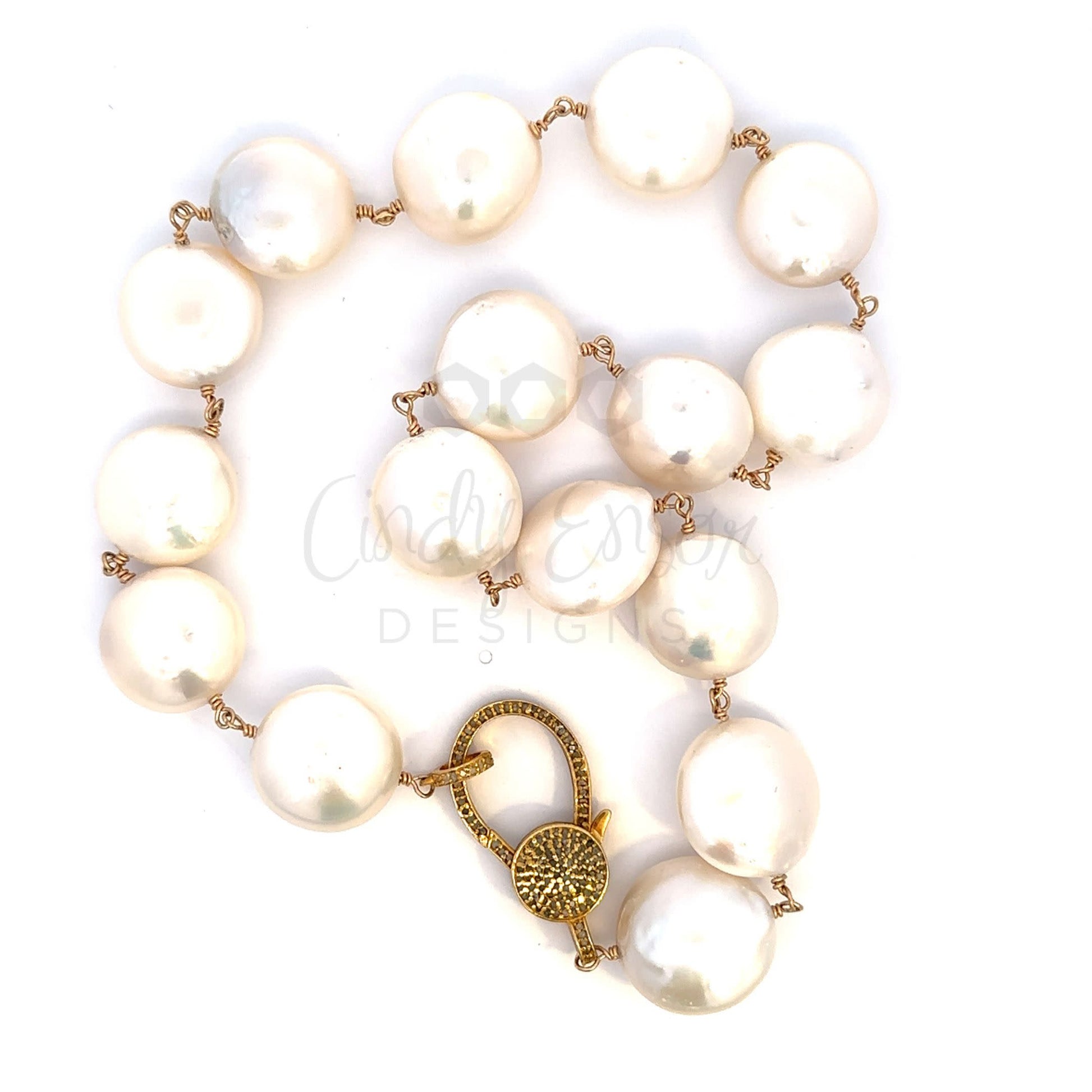 Coin Wire Wrapped Pearl Necklace with Gold Vermeil Pave Lobster