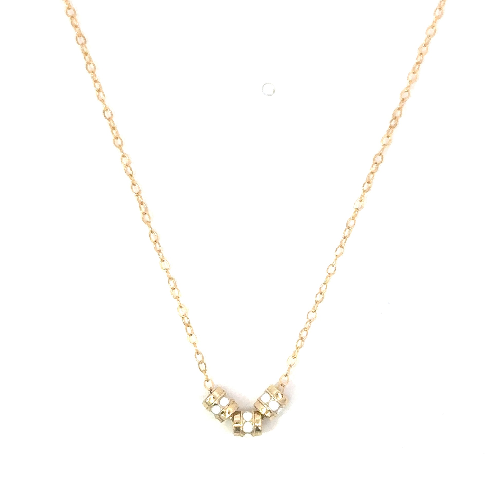 This necklace features a gold-filled chain adorned with three 14k gold enamel barrel charms. The enamel comes in turquoise, red, or white. The length is adjustable between 15" and 16", with each barrel measuring 4mm in diameter.