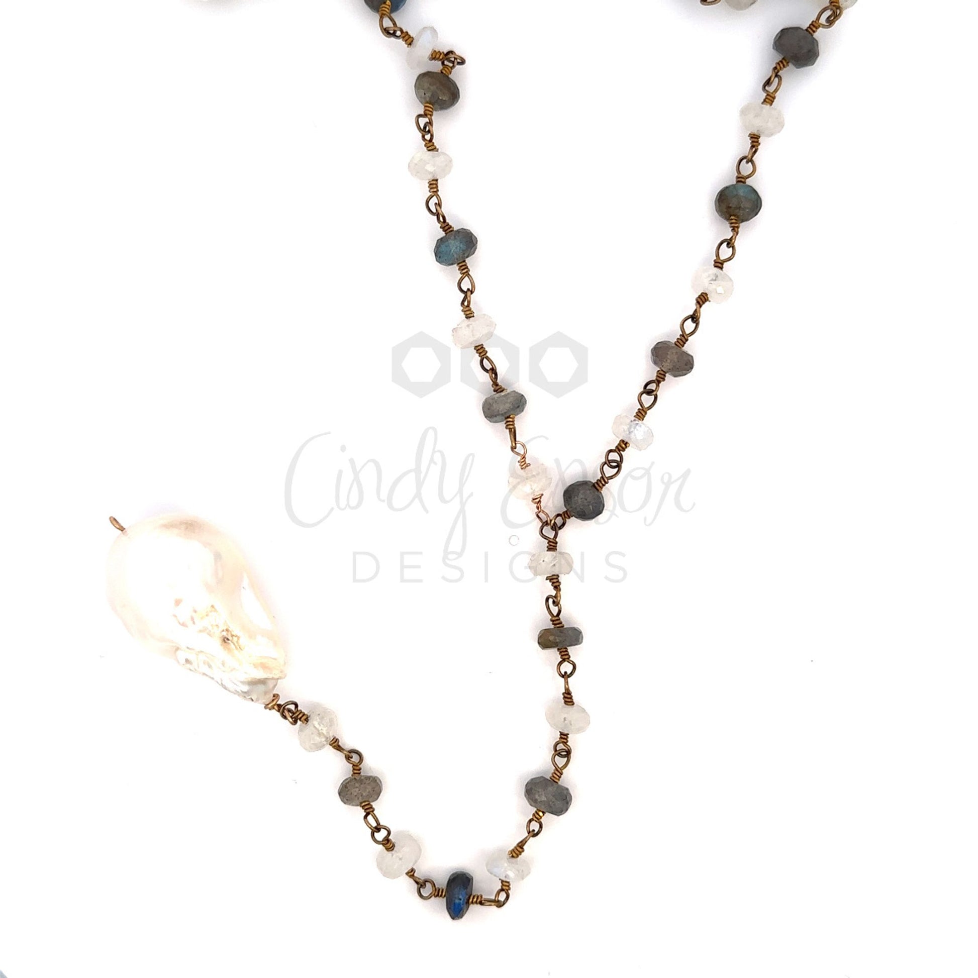 Labradorite and Moonstone Y Drop Necklace with Baroque Pearl Drop