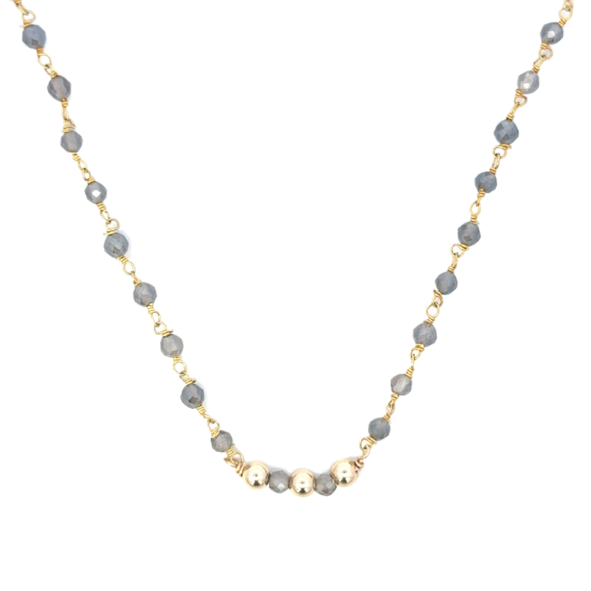 This 16-inch rosary chain features labradorite gemstones accented by three gold-filled balls, combining elegance with durability.