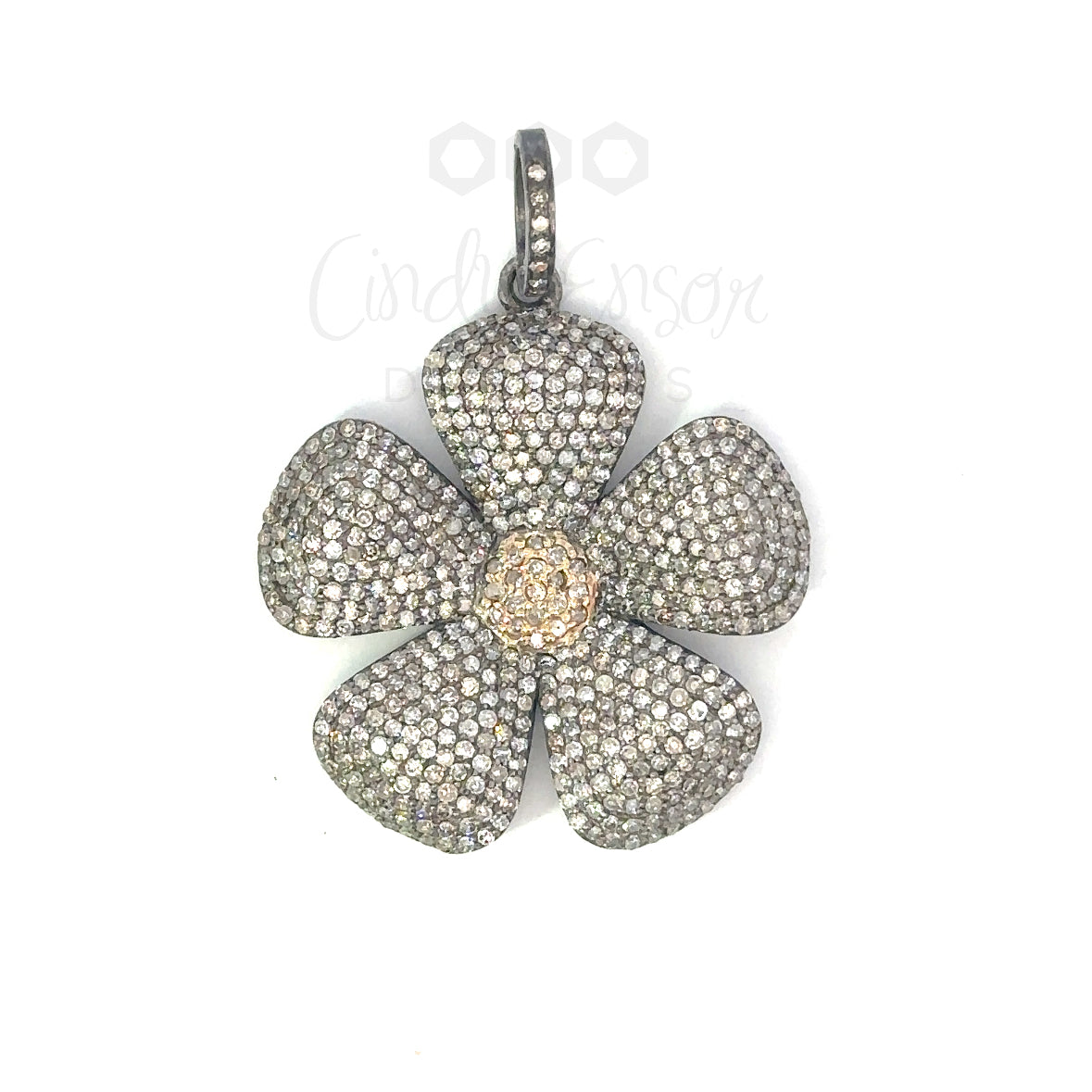 Large Sterling Pave Flower Pendant with Yellow Gold Center