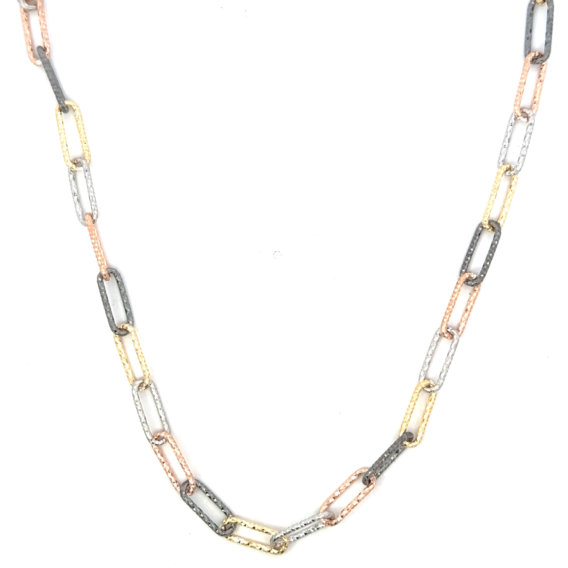 This 36-inch paper clip chain features medium-sized links in a quad gold finish, enhanced by a sharp diamond-cut design for an elegant appearance.
