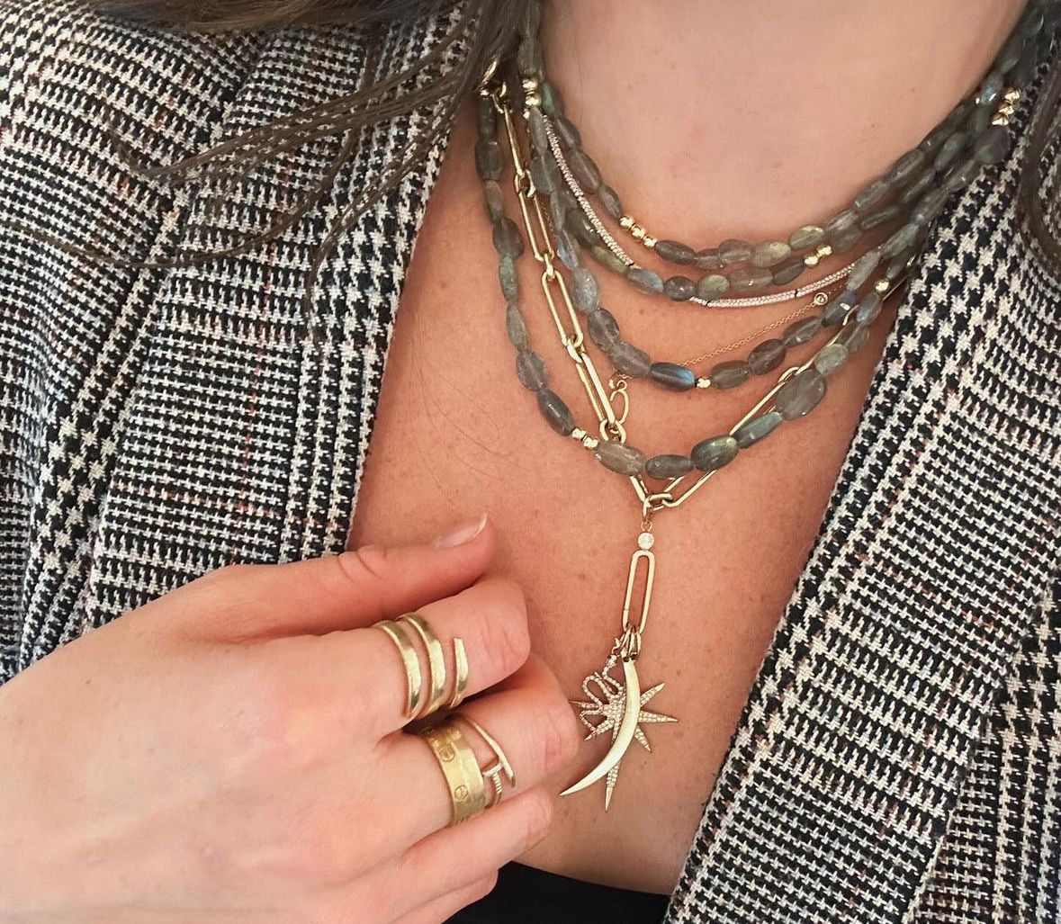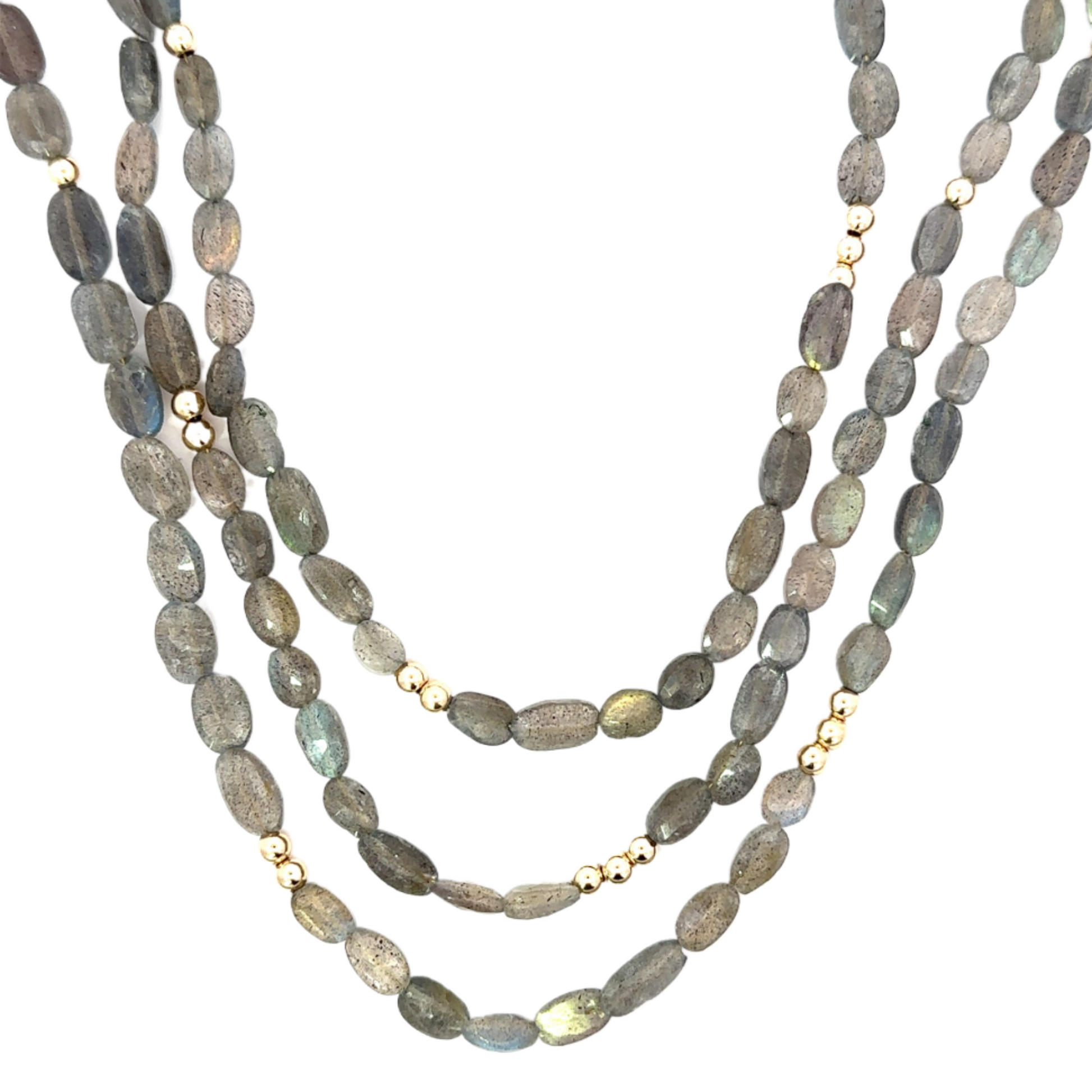 This necklace features 64 inches of oval labradorite beads paired with 4mm gold-filled beads and secured with a gold-filled toggle clasp for a refined finish.