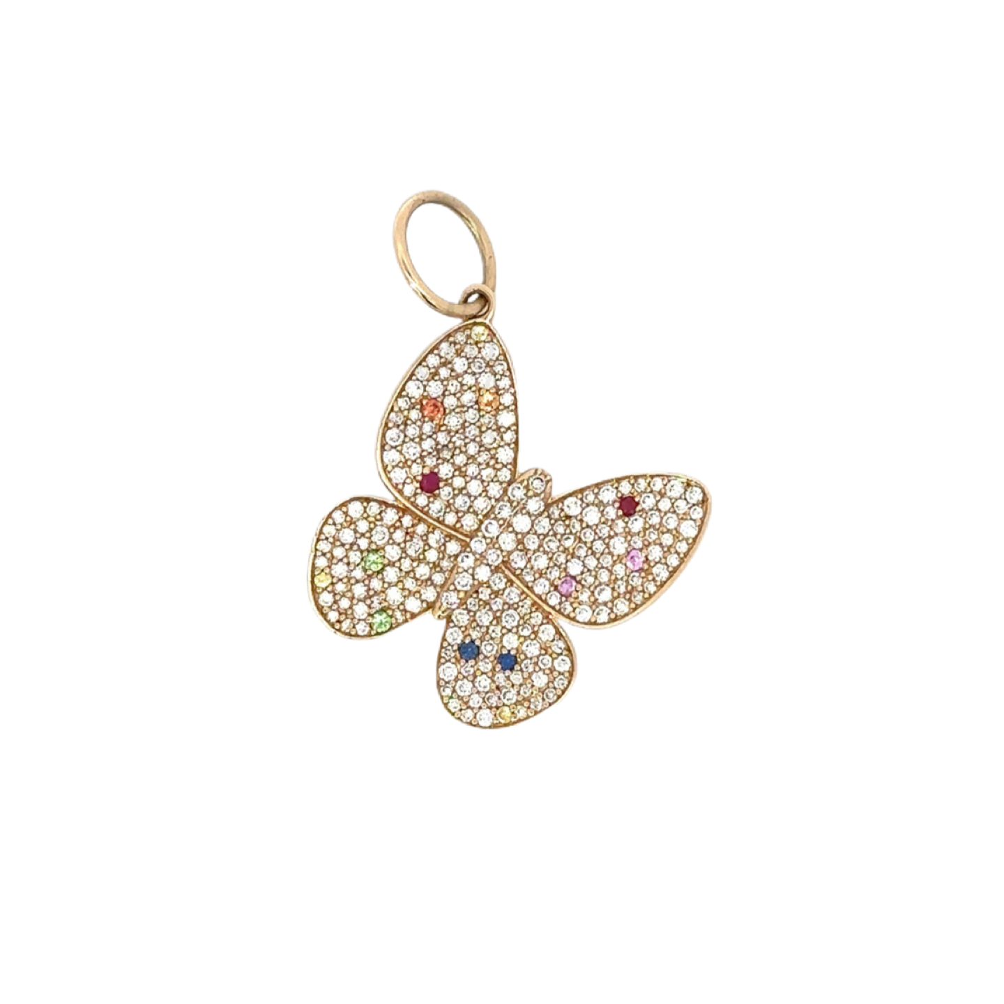 Yellow Gold Pave Diamond Butterfly Pendant with Rainbow Sapphire Accents