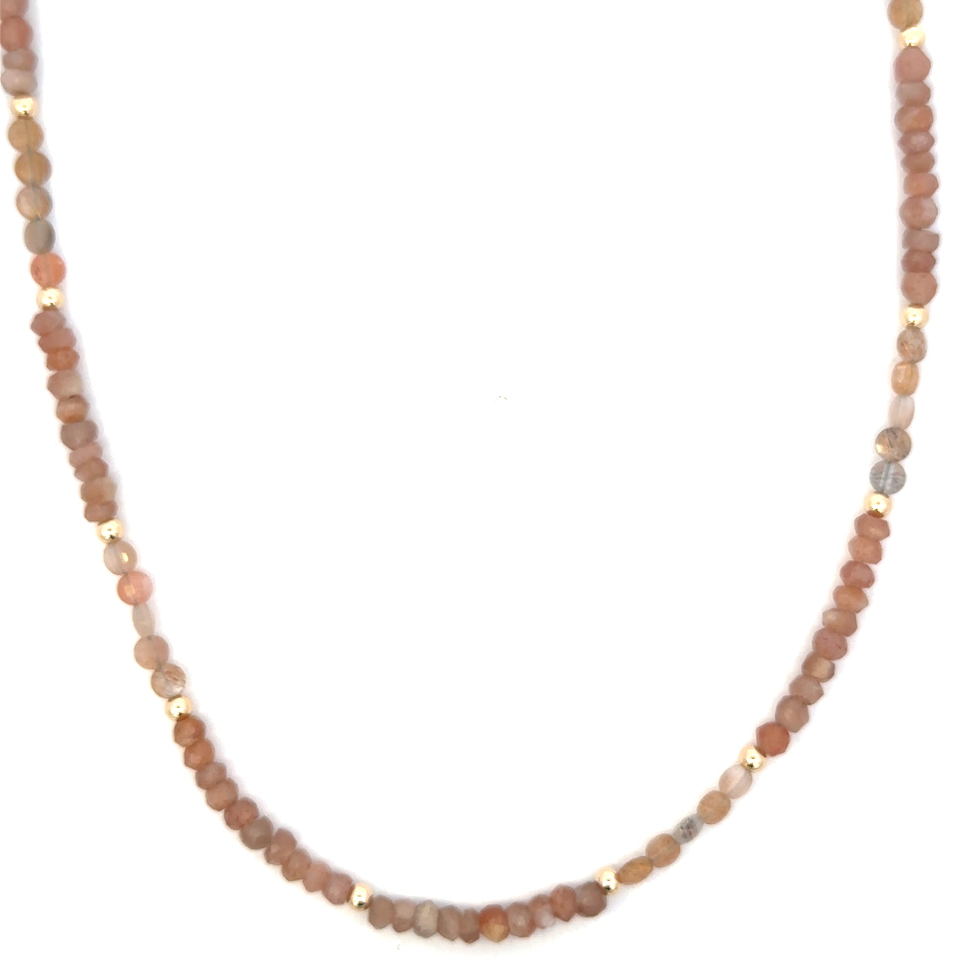 Adjustable 16-18" length featuring 3mm peach moonstone beads complemented by 3mm gold-filled accents.