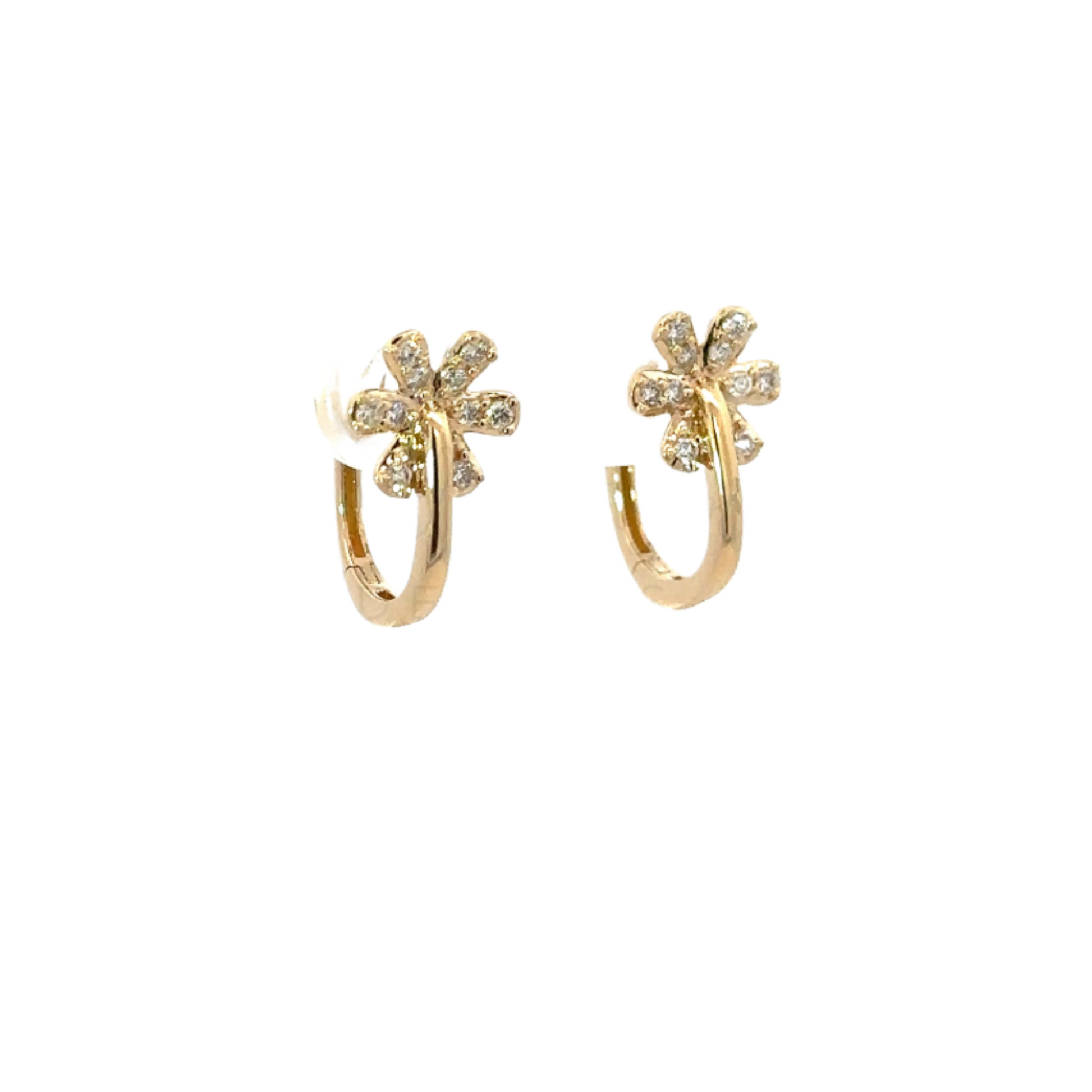 These 12mm huggie earrings feature an 8.5mm pave flower post crafted in 1.73g of 14K yellow gold, accented with 0.17 carats of diamonds.