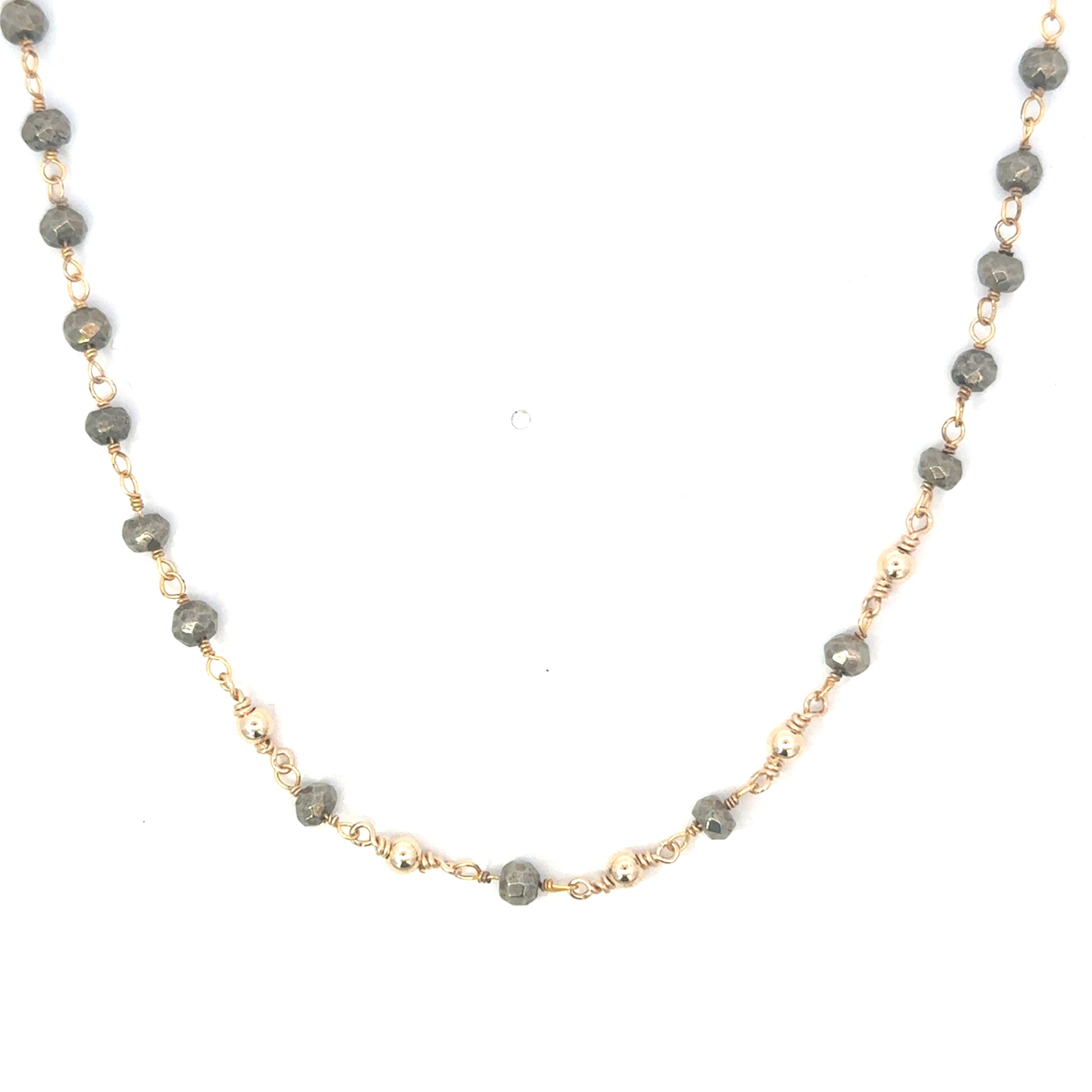 This 16-inch chain features pyrite beads complemented by five gold-filled balls, combining durability with refined elegance.