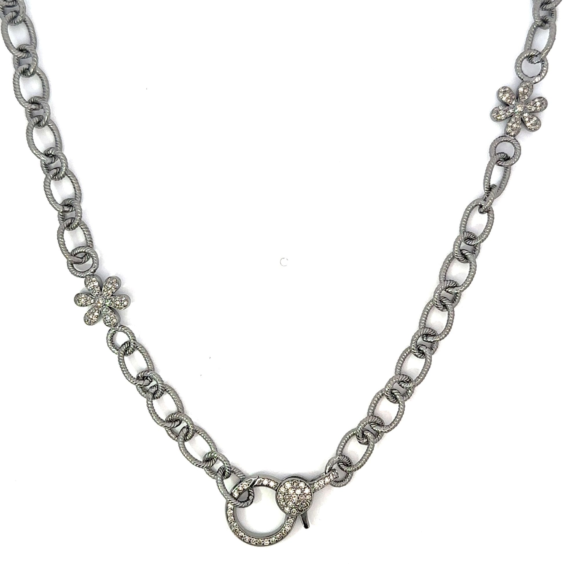 Oval Link Sterling Chain Accented by Two Sterling Pave Flowers and Sterling Pave Lobster