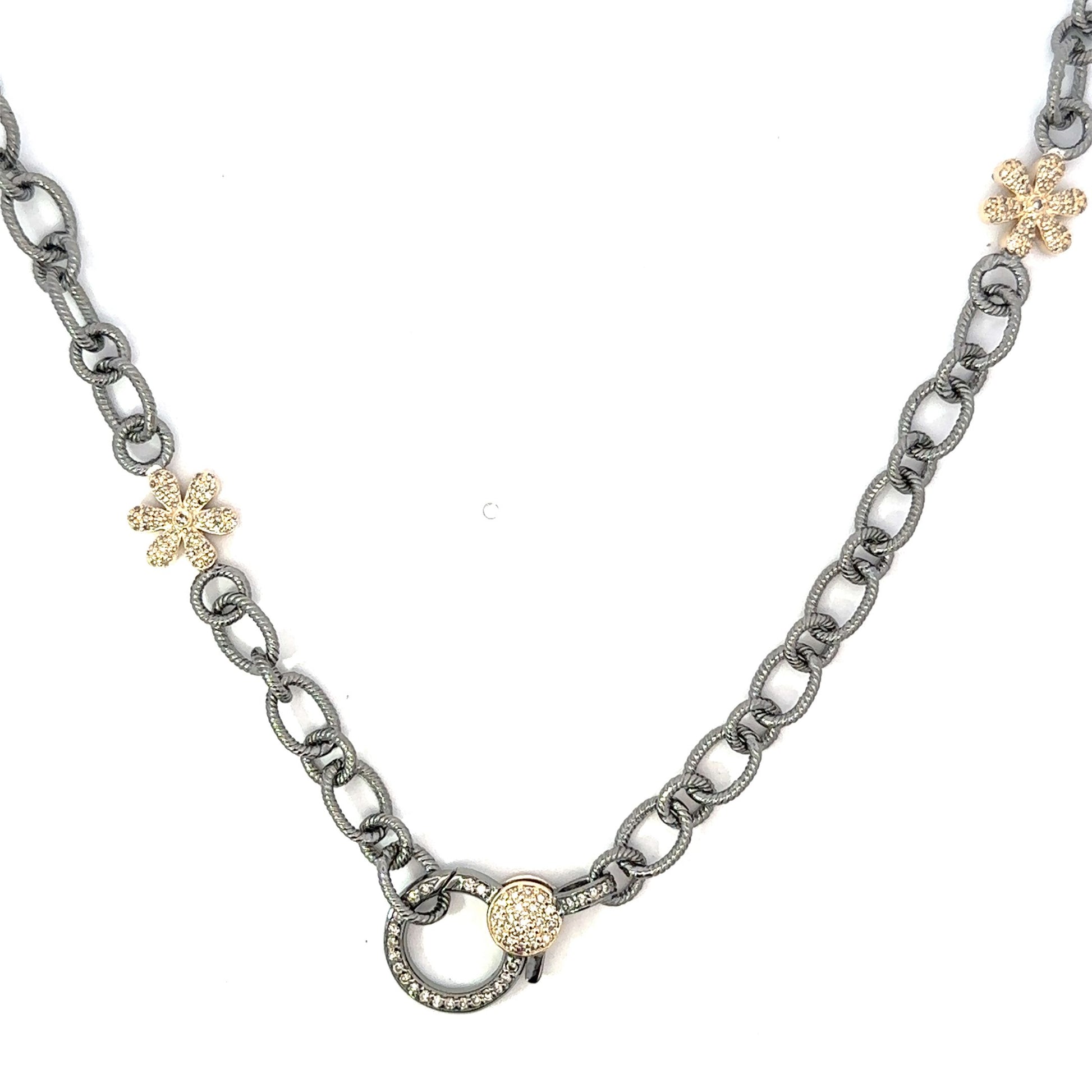Oval Link Sterling Chain Accented By Two Yellow Gold Pave Flowers and Two Tone Lobster