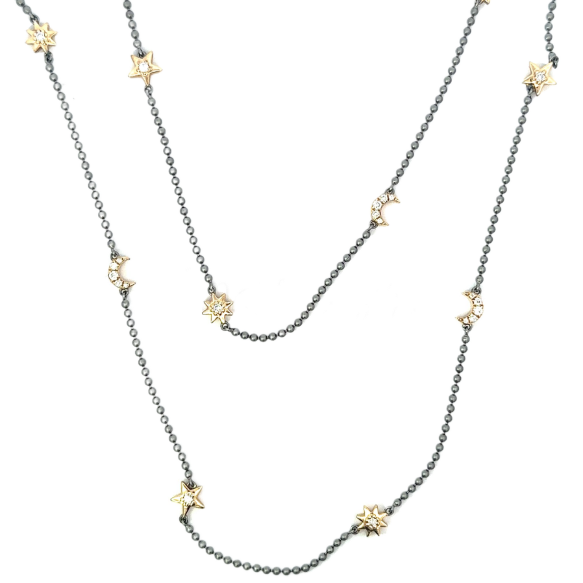 Sterling Bead Necklace with Yellow Gold and Diamond Moon and Star Accents