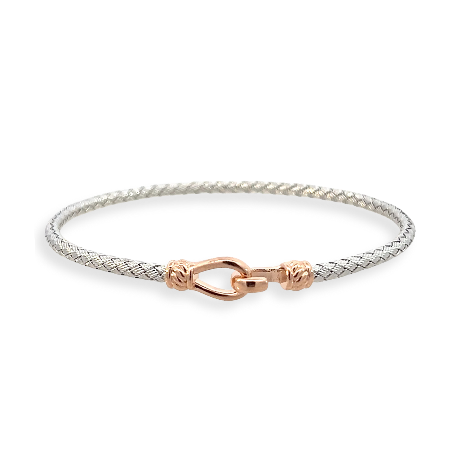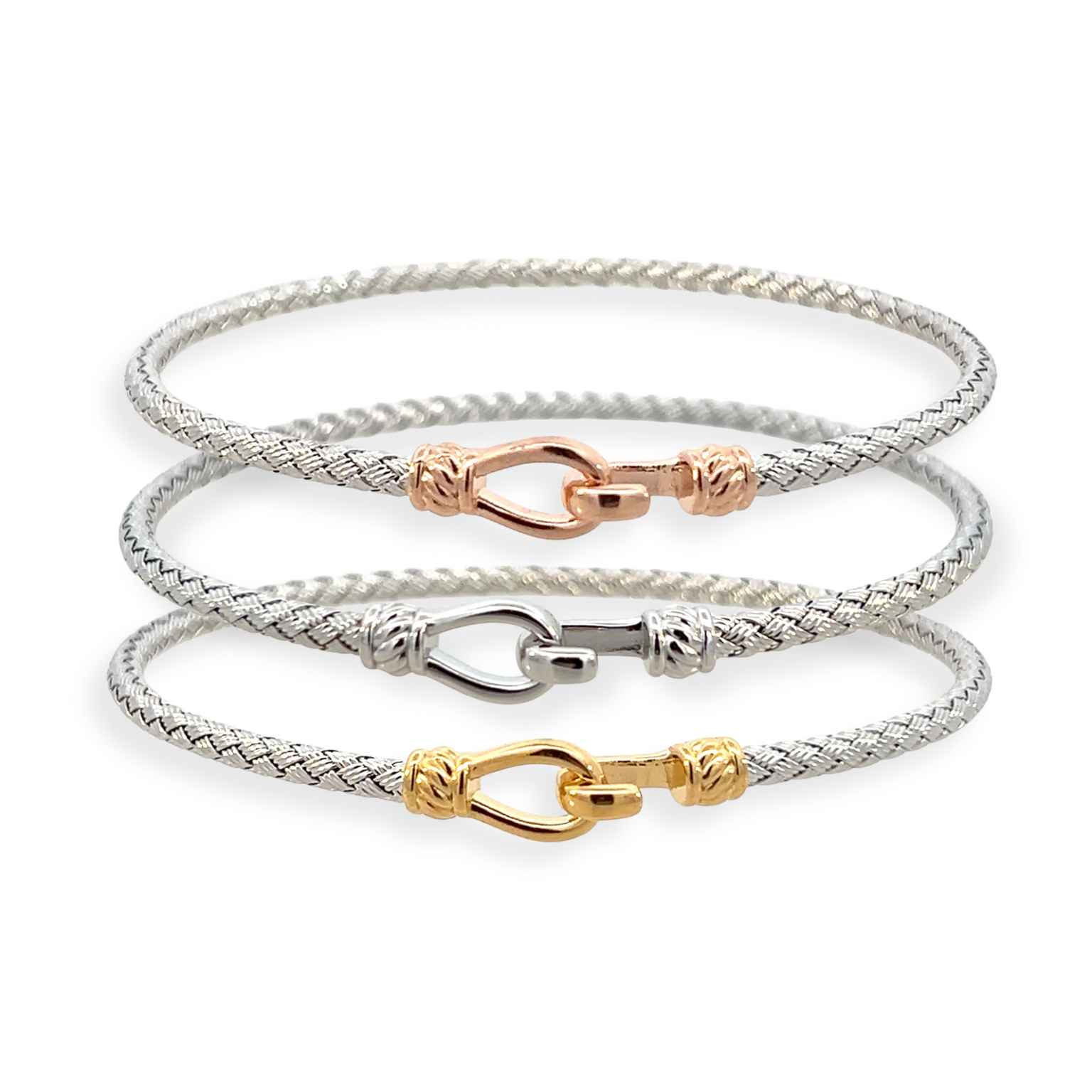 Sterling silver cuff bracelet with sterling, yellow or rose gold plated buckle closure.