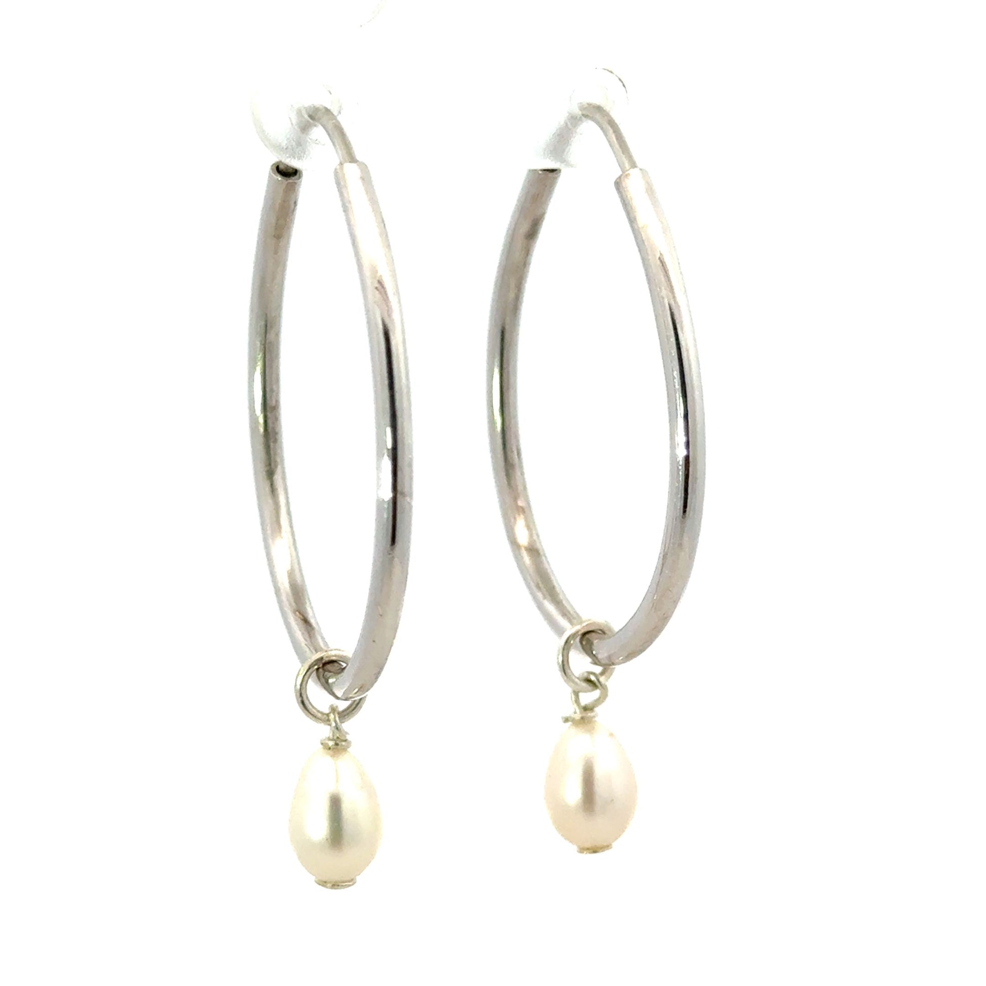 Oval hoops crafted from sterling silver feature a delicate pearl drop. Hoop dimensions measure 1.5" by 1", while the pearl drop adds an additional 0.5" length.