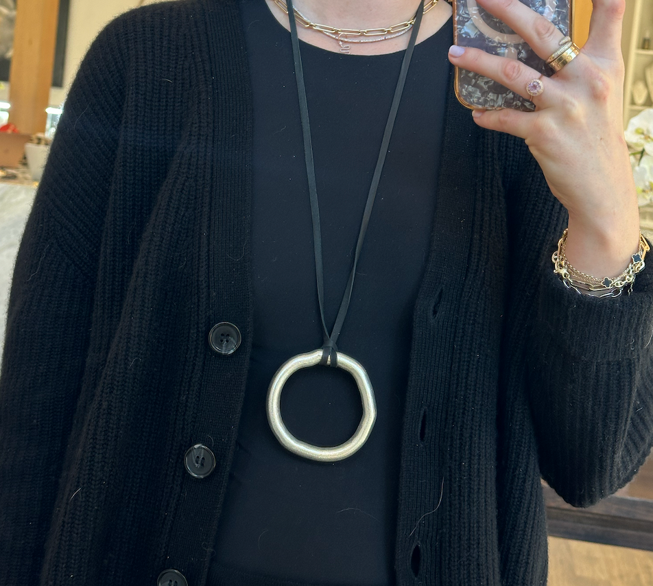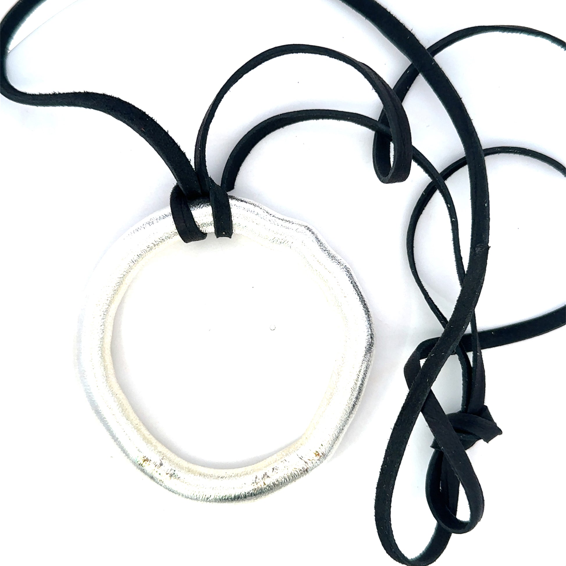 This necklace features a sterling silver circle pendant in an unoxidized finish, paired with a black leather cord. The length is adjustable, secured with a knot at the back for a customized fit.