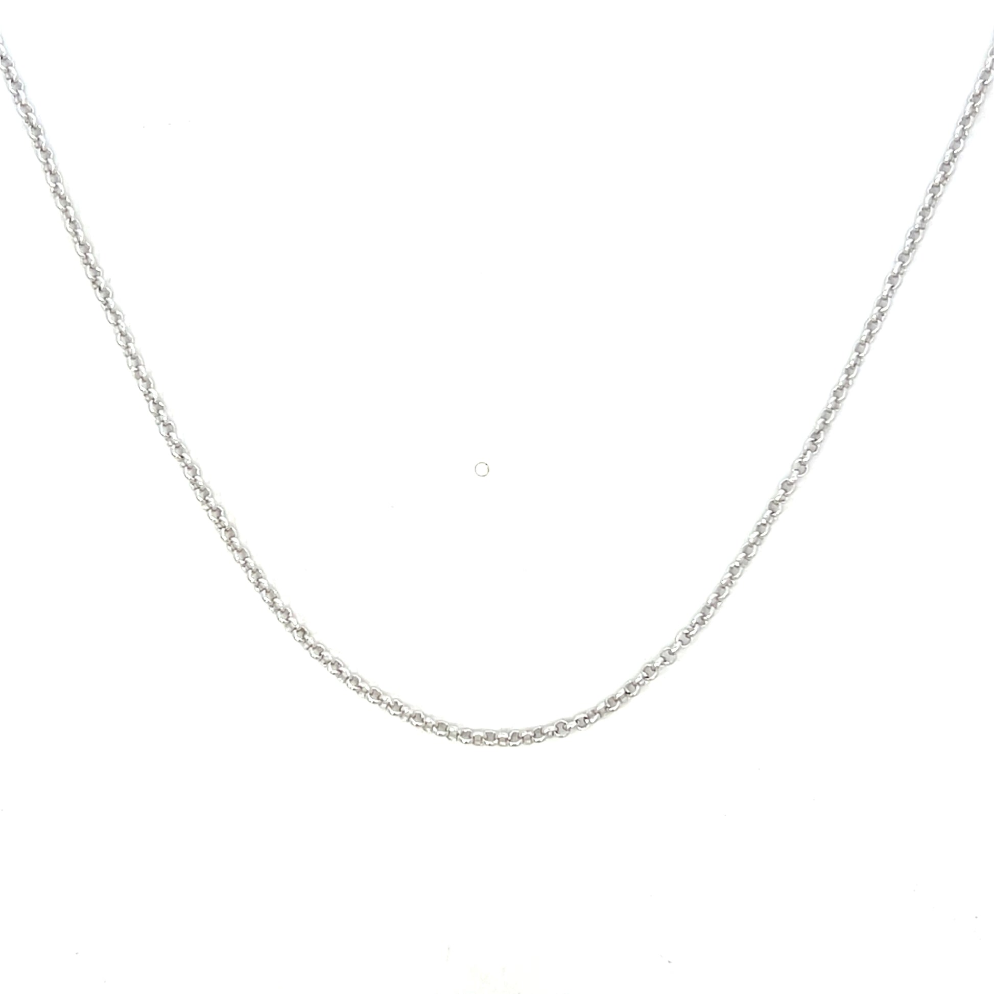 This 2mm rolo chain is crafted from sterling silver in its natural, unoxidized state, offering a bright and polished finish. Available in multiple lengths.
