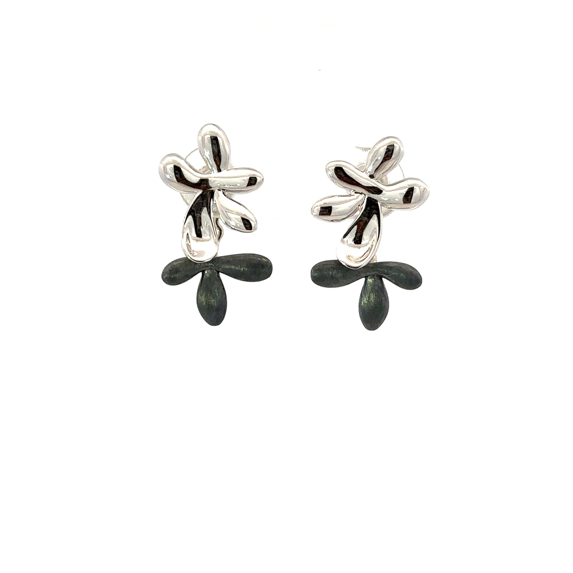 These front and back stud earrings feature an unoxidized sterling silver top half paired with a brushed oxidized sterling silver bottom half. The top piece measures 14.8mm by 10.5mm, while the bottom piece is 7.6mm by 12mm, showcasing expert craftsmanship in contrasting finishes.