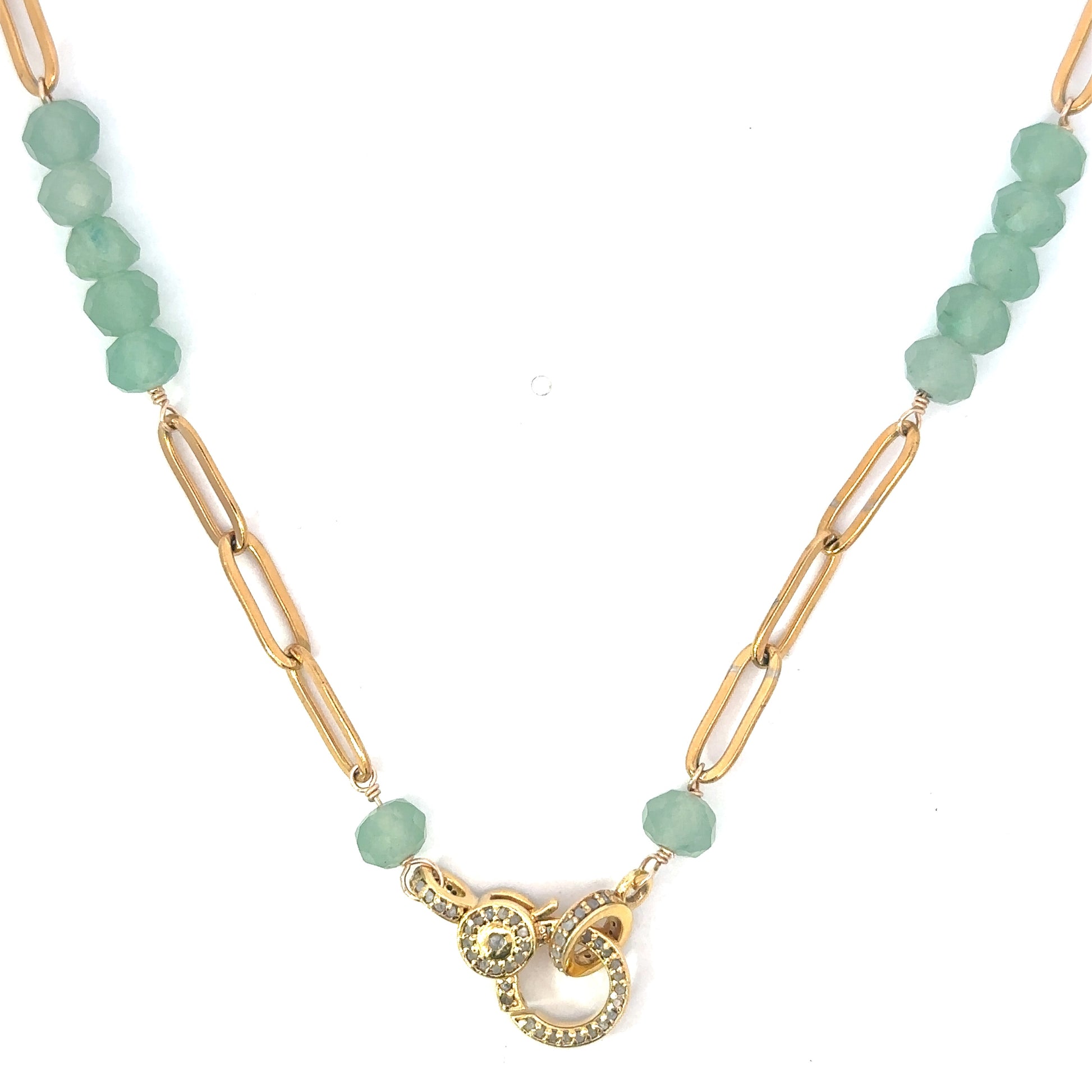 Vermeil Paper Clip and Green Bead Alternating Necklace with Pave Diamond Lobster