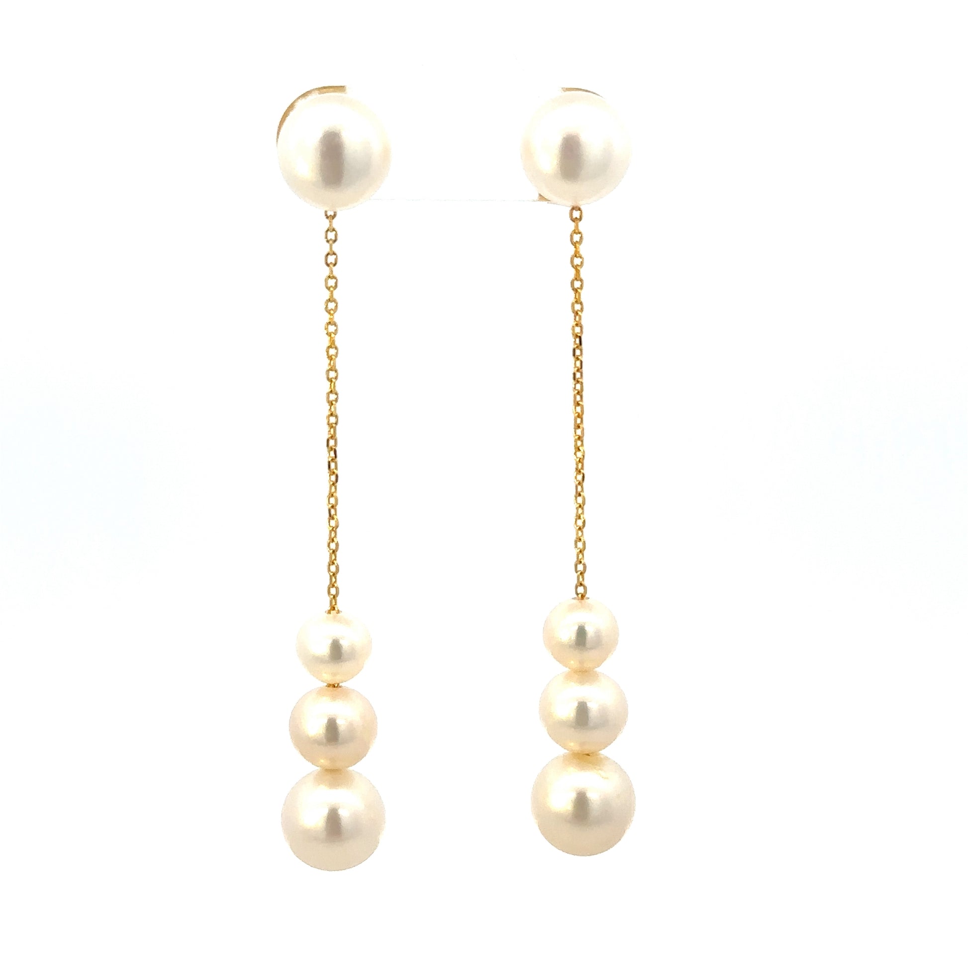 These earrings feature a 2-inch drop design, crafted with sterling silver plated in 14k yellow gold. They showcase pearls measuring between 5 and 8mm for a refined, classic appeal.