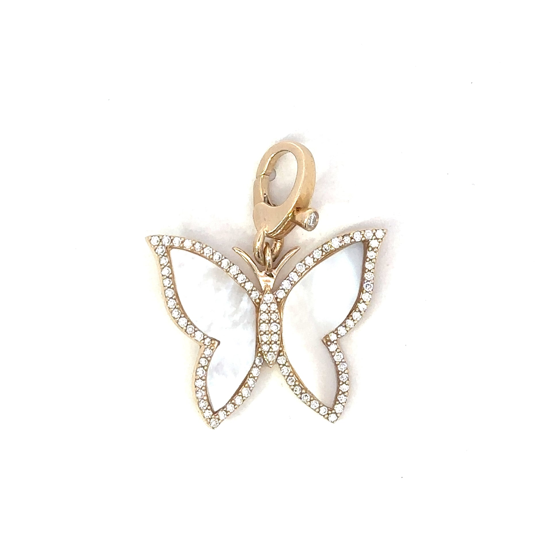 Measuring 20mm long by 25mm wide, this butterfly pendant features wings crafted from white mother of pearl set in 14k yellow gold. It includes a clip-on lobster clasp and showcases a bezel-set diamond for refined elegance.