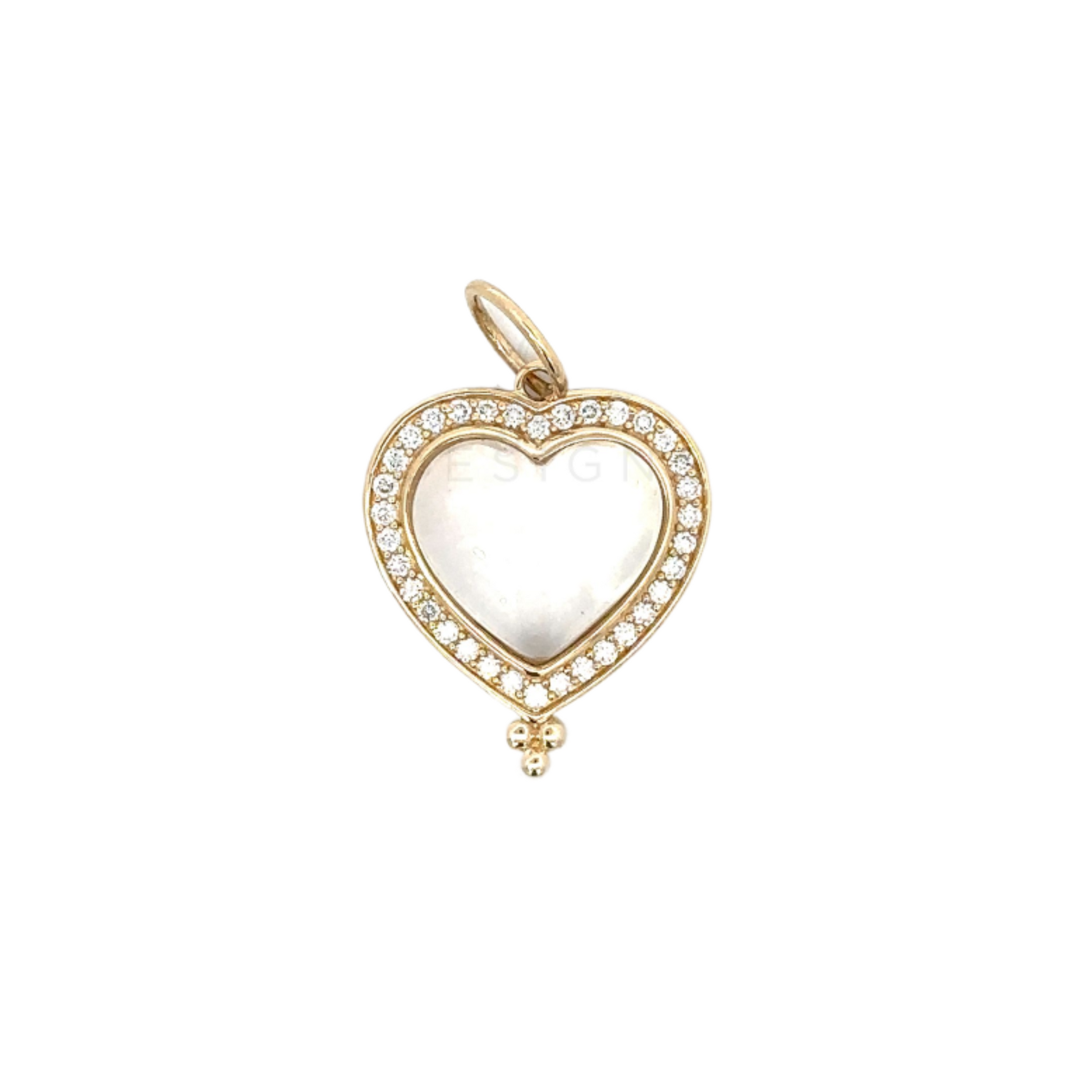 This pendant measures 19mm wide by 22mm high and is crafted from 14k yellow gold weighing 2.17 grams. It features a heart-shaped design adorned with 0.33 carats of diamonds and a 4.54-carat white topaz centerpiece.