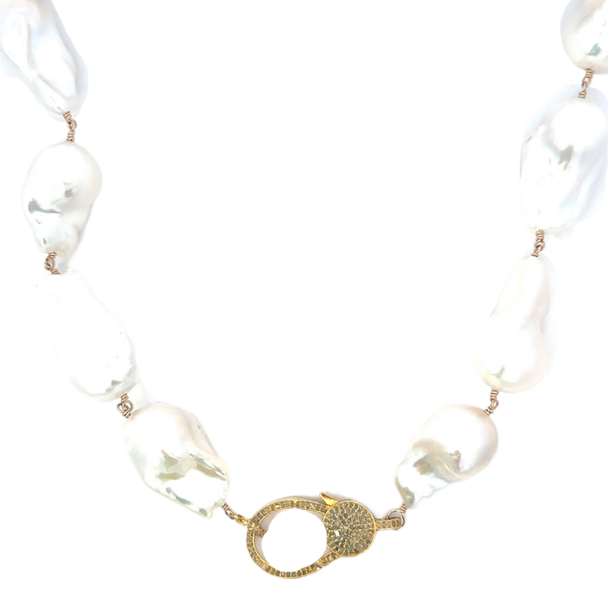 Wire Wrapped White Baroque Pearl Necklace with Vermeil Diamond Lobster