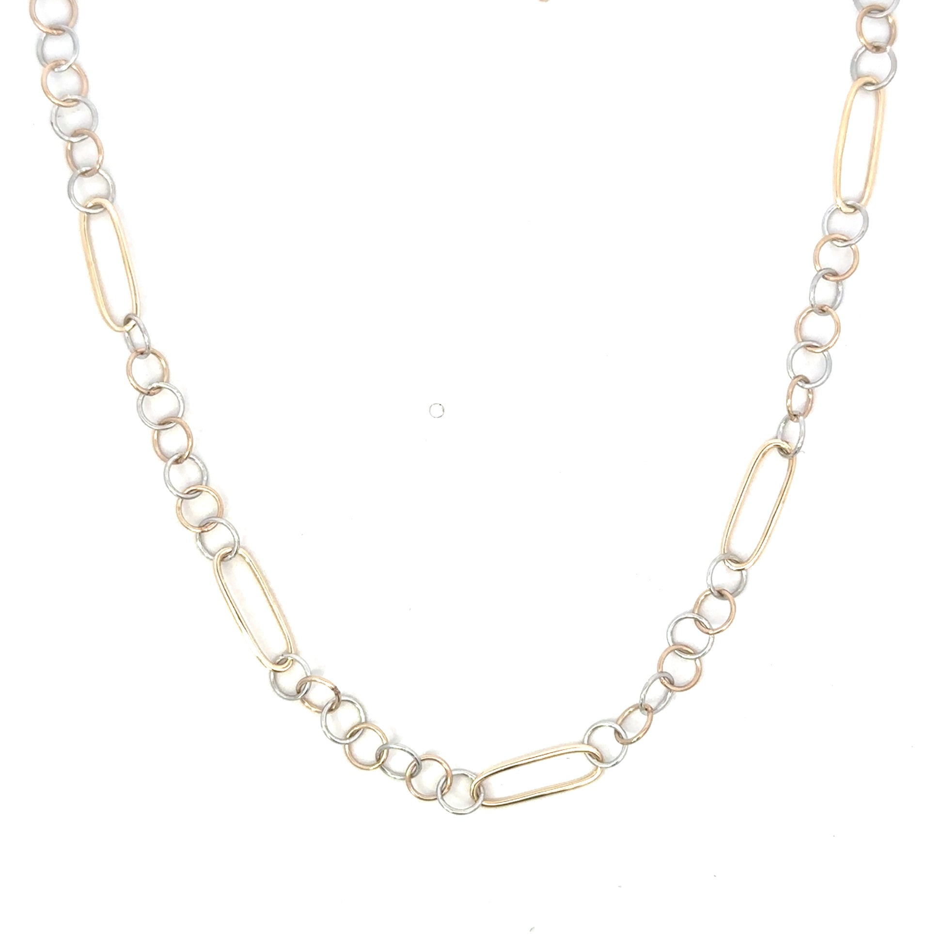This necklace features a total length of16-18" crafted from 14K yellow gold and sterling silver, with oval links measuring 14.3mm long by 5.18mm wide, complemented by circular links of 4.5mm diameter. The design combines vintage elegance with durable materials for a timeless accessory.