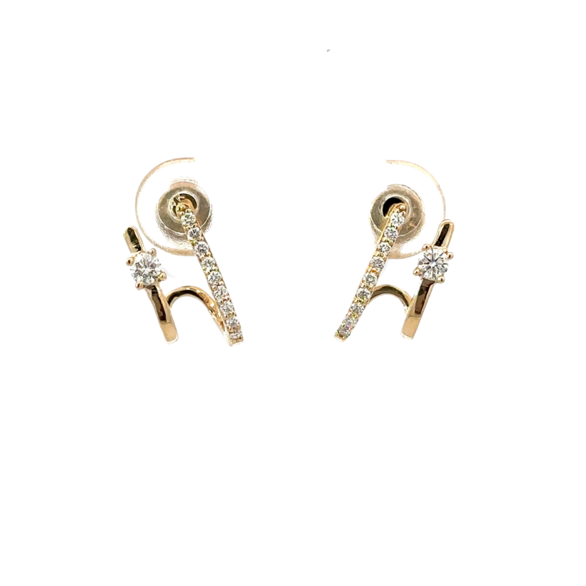 Crafted in 14K yellow gold, this double faux huggie earring weighs 1.75g and features 0.23ct of pave diamonds. Designed to mimic a double piercing, it combines a longer huggie side measuring 12.5mm with a shorter side at 10.2mm, each accented by a 2.7mm diamond. The post earring offers sophisticated elegance and layering without multiple piercings.