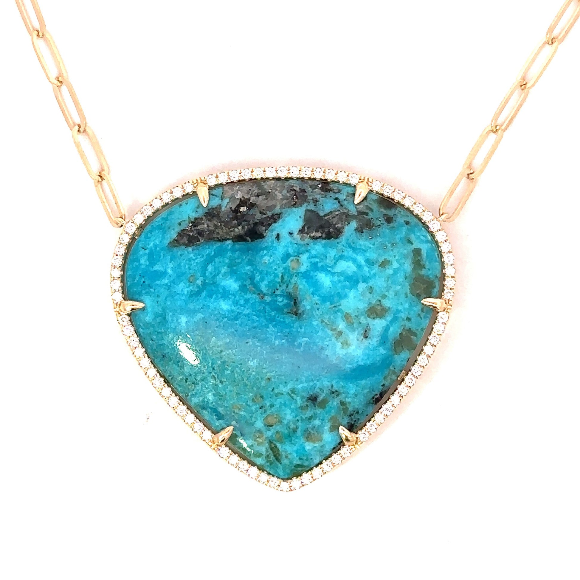 This necklace offers a total adjustable length of 16-18" featuring paper clip links measuring 6.2mm long by 2.4mm wide. The turquoise pendant measures 32.4mm in length and 34.4mm in width, highlighted by 0.34 carats of pave diamonds. Made from 6.07 grams of 14K yellow gold with the turquoise stone weighing 35.13 grams.