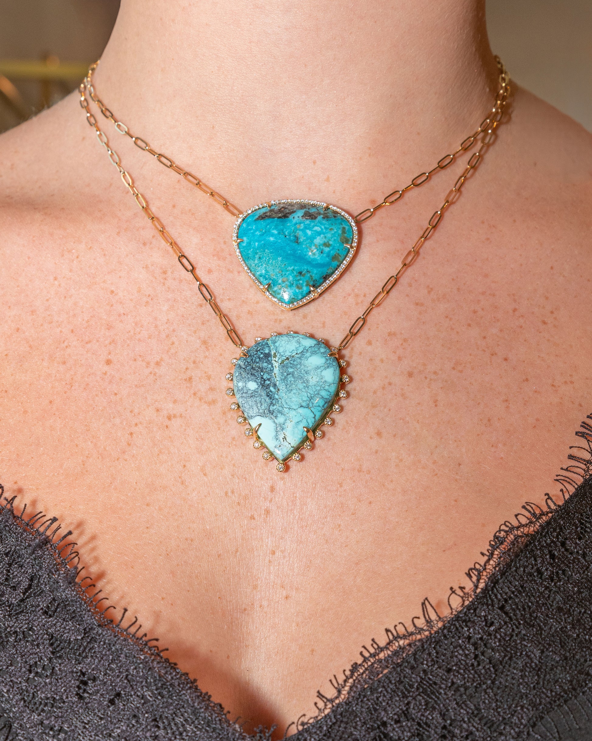 Yellow Gold Organic Triangle Turquoise Paper Clip Necklace with Pave Border