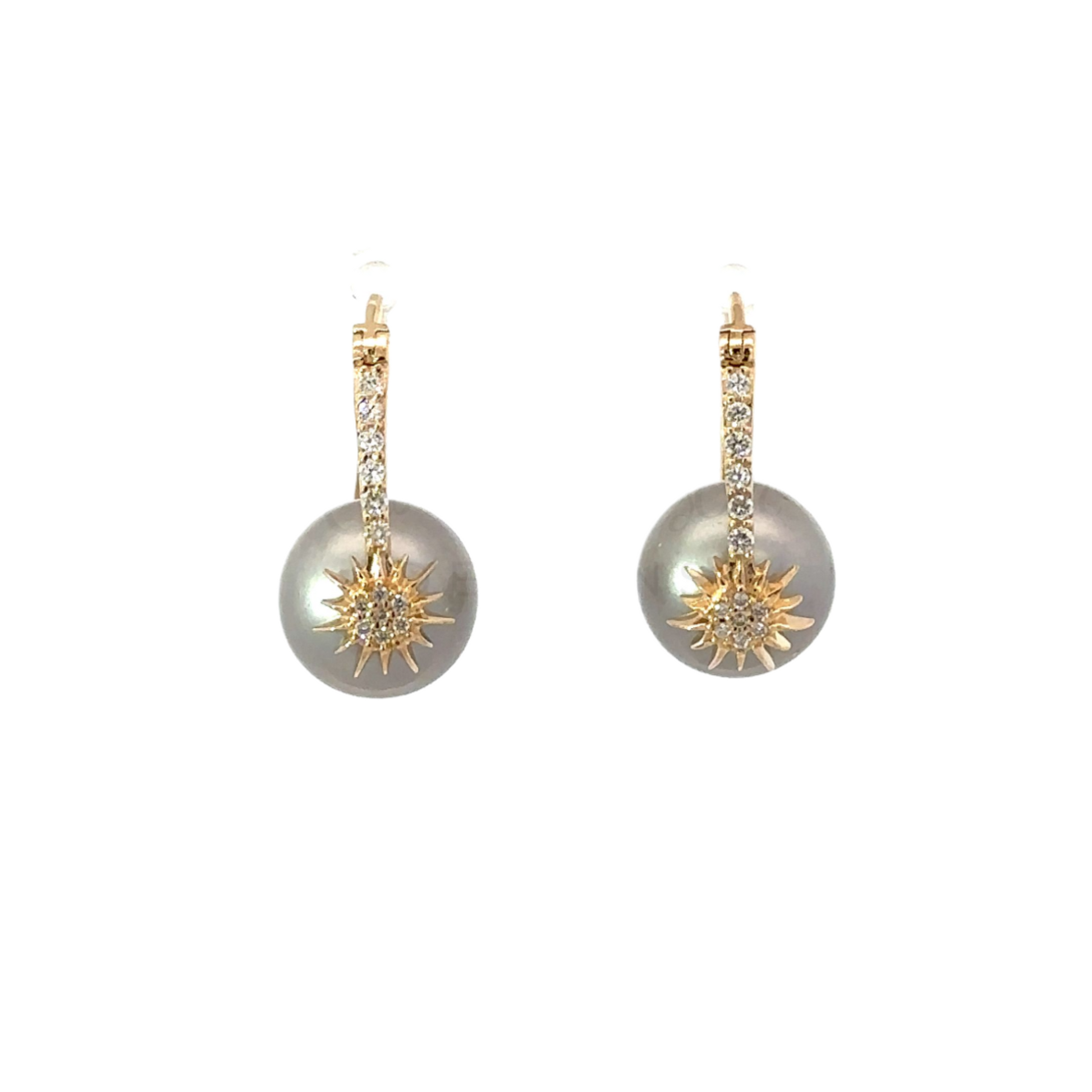 Offered with grey or white pearls, these earrings feature 9.6mm pearls and measure 20mm in total length, accented by a 6.5mm diamond starburst. Crafted in 14K yellow gold, they weigh 1.59g and are adorned with 0.12ct of diamonds.