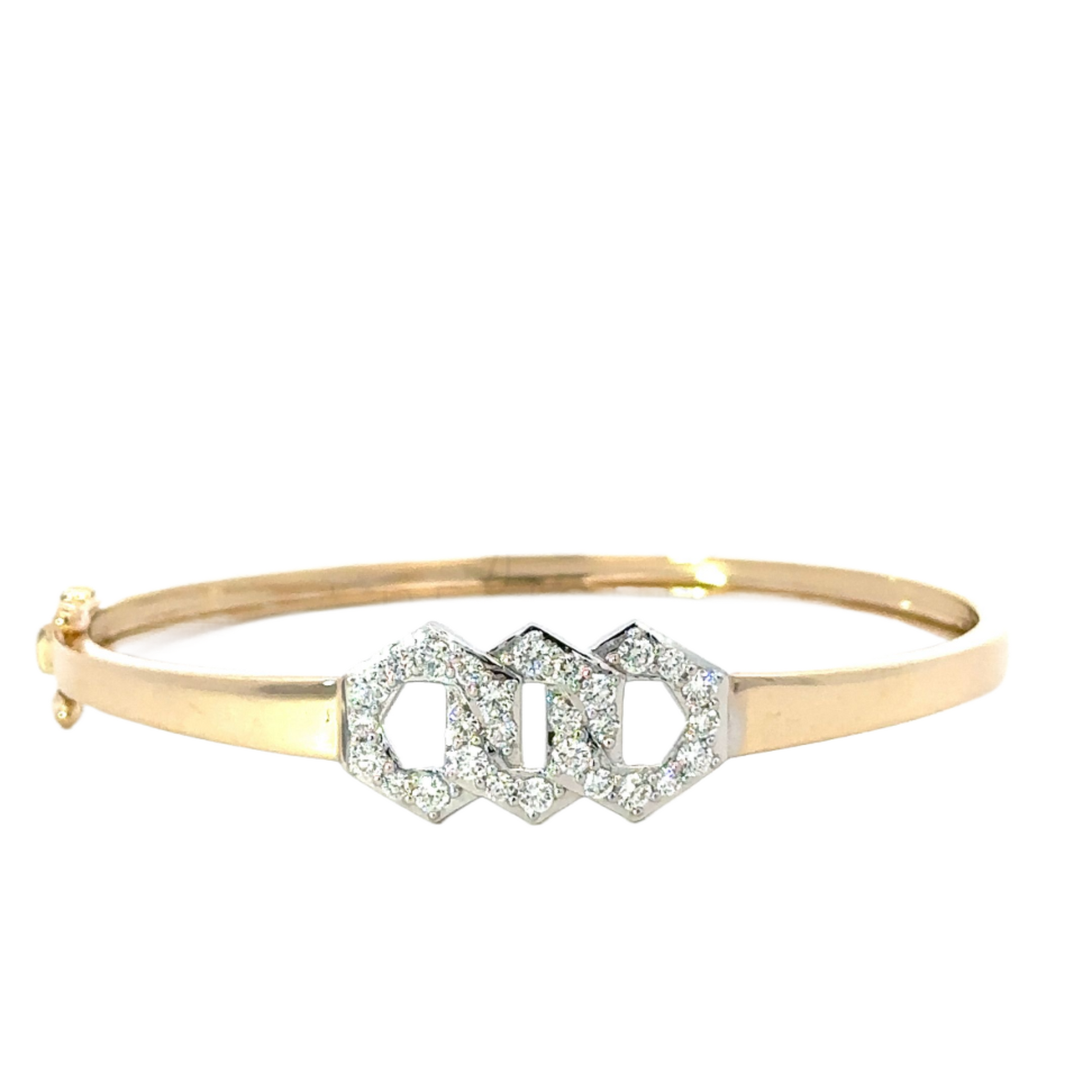 Crafted from 14K yellow gold, this 7-inch bracelet showcases three interlocking hexagons in pave white gold. The bracelet measures 3.7mm in width, with each hexagon sized at 12.3mm length by 10.5mm width. It contains 14K yellow gold weighing 12.15 grams and diamonds totaling 0.94 carats.