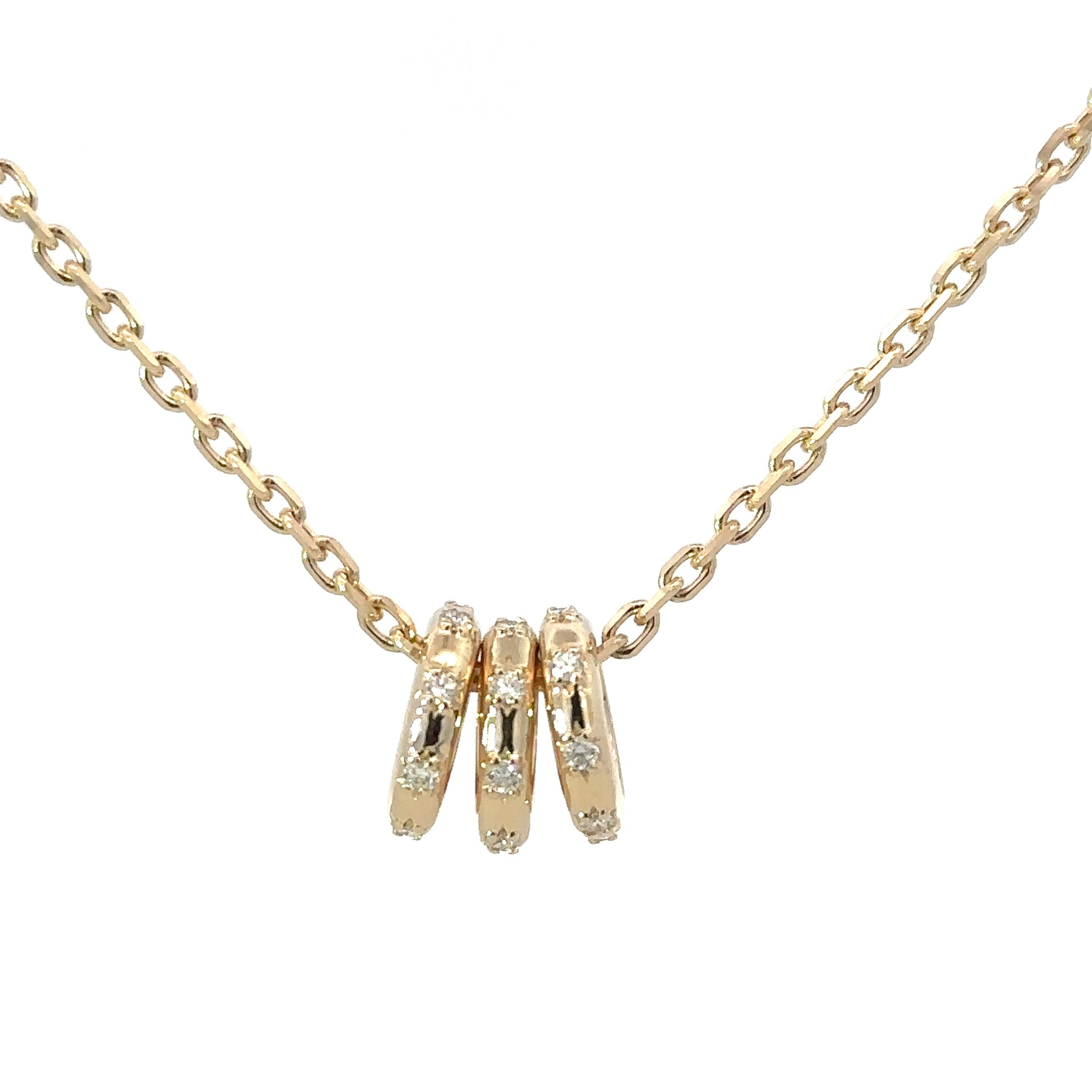 This necklace features an adjustable 16-18" chain adorned with three diamond roundels, each measuring approximately 10.6mm by 2.6mm with 1.5mm diamonds. Crafted in 14K yellow gold, it weighs 8.55 grams, offering a refined and elegant touch.