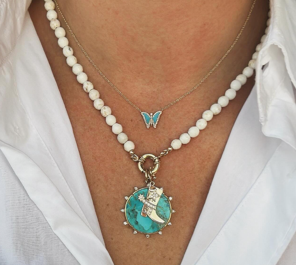 This 32mm disc pendant features 14k yellow gold combined with turquoise, elegantly accented by prong-set diamonds.